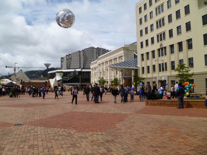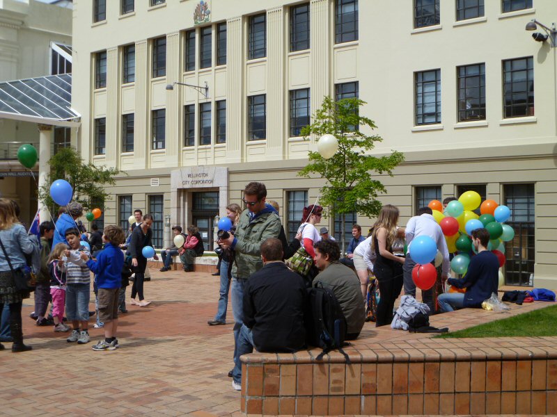I arrived at a quarter after 12, while everyone was still slowly filtering in. Right off the bat, it was clear that this was going to be a positive event, as I saw many a smile as people drifted across the square, greeting friends, finding spots to stand or sit, and snapping pictures. It could not have been even a full ten minutes before someone offered me a balloon; the square was full of them, brightly coloured and bobbing along to the beat of music playing from the loudspeakers near the City-to-Sea Bridge.