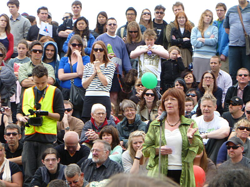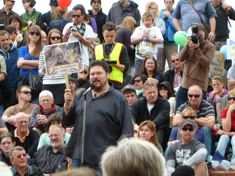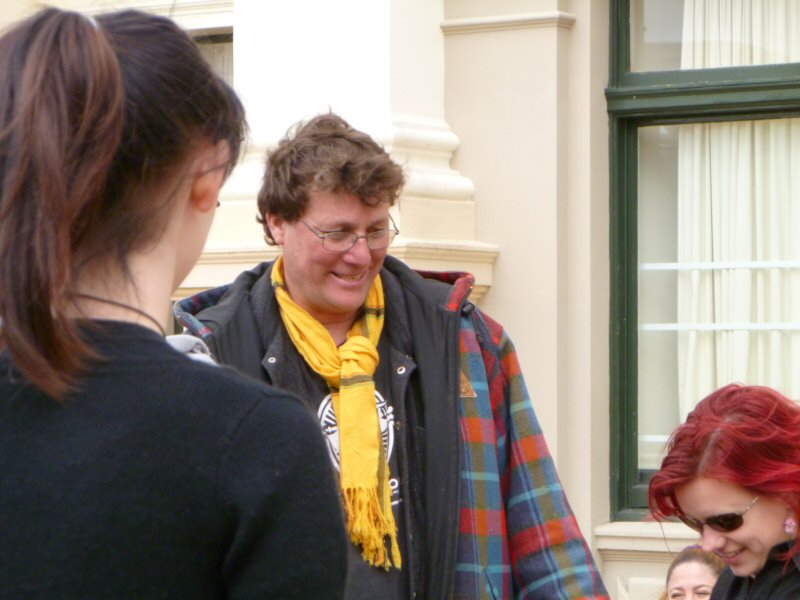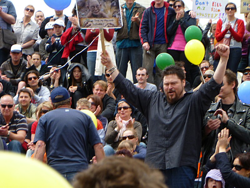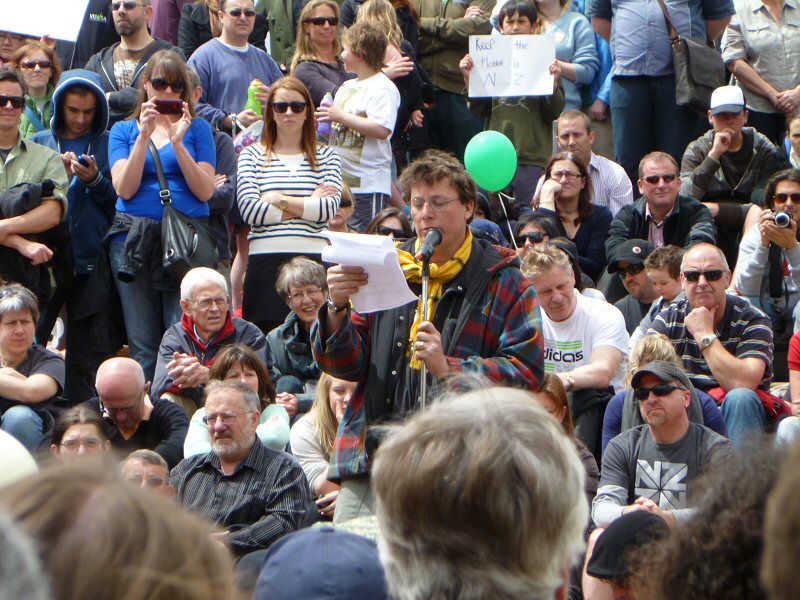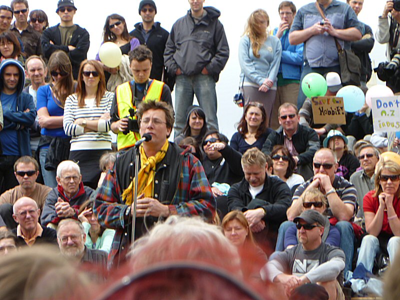 Next up was Richard Taylor, who gave a wonderful speech about the importance of the New Zealand arts community, and how very much The Lord of the Rings means to this country. Once he passed on Peter Jackson’s and Fran Walsh’s apologies for not being at the rally (because they are understandably quite busy just now), Richard read a really lovely letter from the two of them, thanking everyone for coming, for supporting the film industry, for being part of the making of LotR, and for being fans. There was a little dash of politics in the letter as well, primarily regarding the wisdom of allowing other countries to control the workings of New Zealand itself, but the primary message was a positive one.