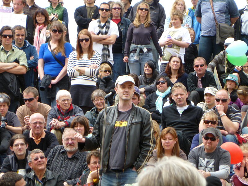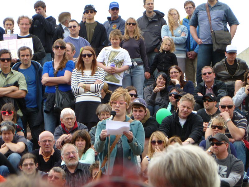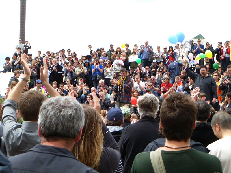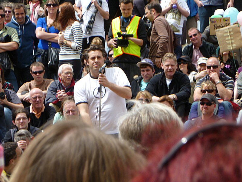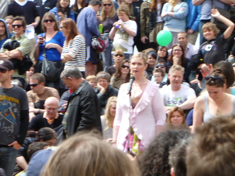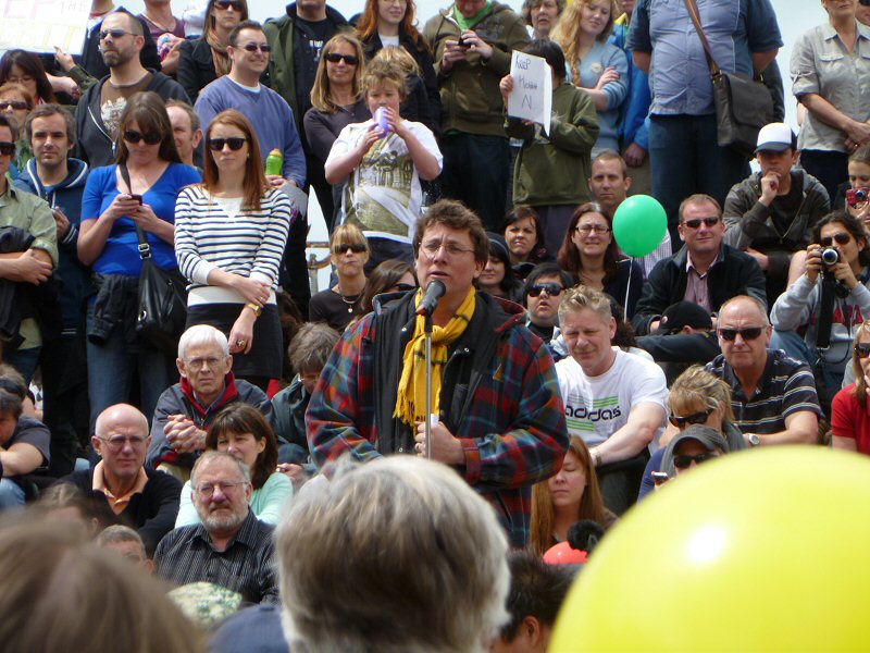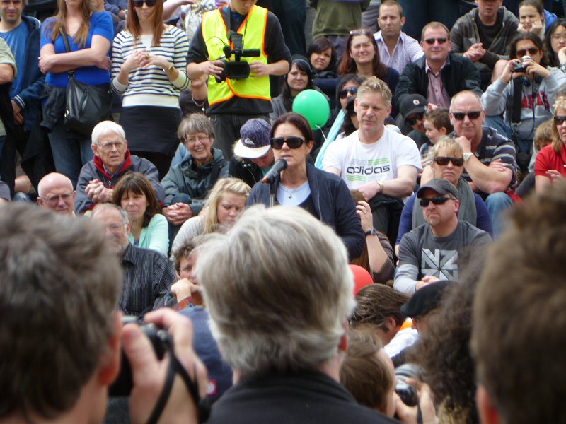 Next up was Richard Taylor, who gave a wonderful speech about the importance of the New Zealand arts community, and how very much The Lord of the Rings means to this country. Once he passed on Peter Jackson’s and Fran Walsh’s apologies for not being at the rally (because they are understandably quite busy just now), Richard read a really lovely letter from the two of them, thanking everyone for coming, for supporting the film industry, for being part of the making of LotR, and for being fans. There was a little dash of politics in the letter as well, primarily regarding the wisdom of allowing other countries to control the workings of New Zealand itself, but the primary message was a positive one.