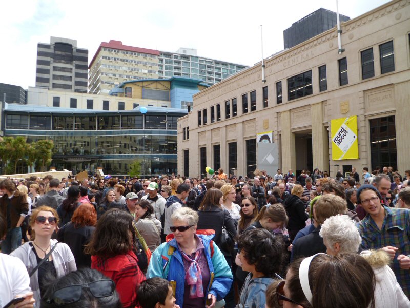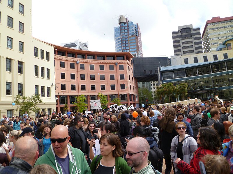 Just before 1pm, with the square full to bursting, the rally got started. After an opening song, Mayor Celia Wade-Brown began with a short speech and rallying cry asking where The Hobbit belongs, to which the crowd replied, “New Zealand!”