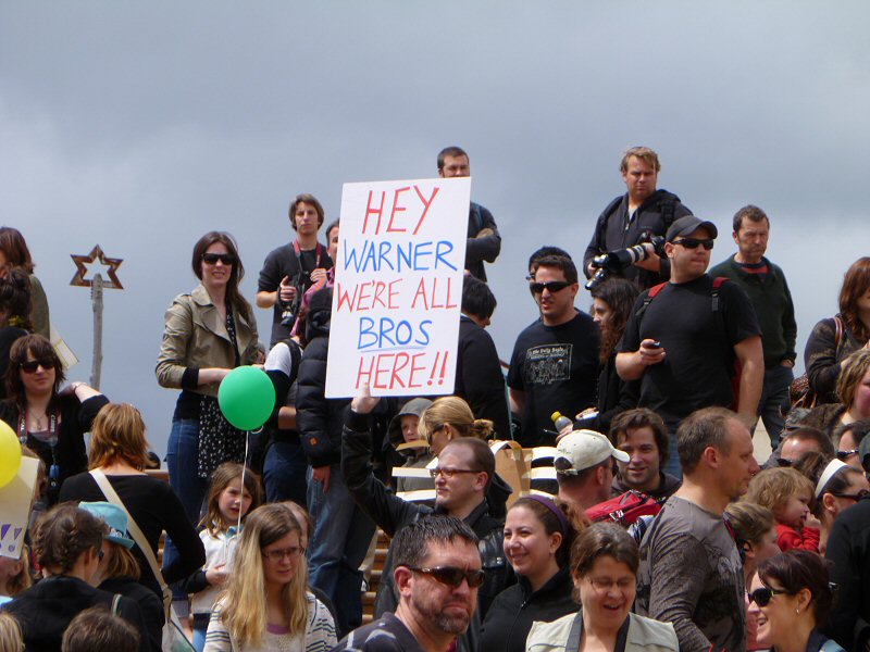 Plenty of people had brought along signs welcoming Warner Bros. to New Zealand and affirming that the only place for Middle-earth is right here. Cast, crew and public mingled shoulder-to-shoulder, and I saw plenty of jackets, shirts and other paraphernalia identifying people’s roles in various Peter Jackson productions sprinkled liberally among the crowd. I wasn’t the only non-New Zealander there, as while I was sporting my Canada/New Zealand flag pin, I also overheard people identifying themselves as American, and more than one of the speakers we were about to hear came from further afield than the North and South Islands.