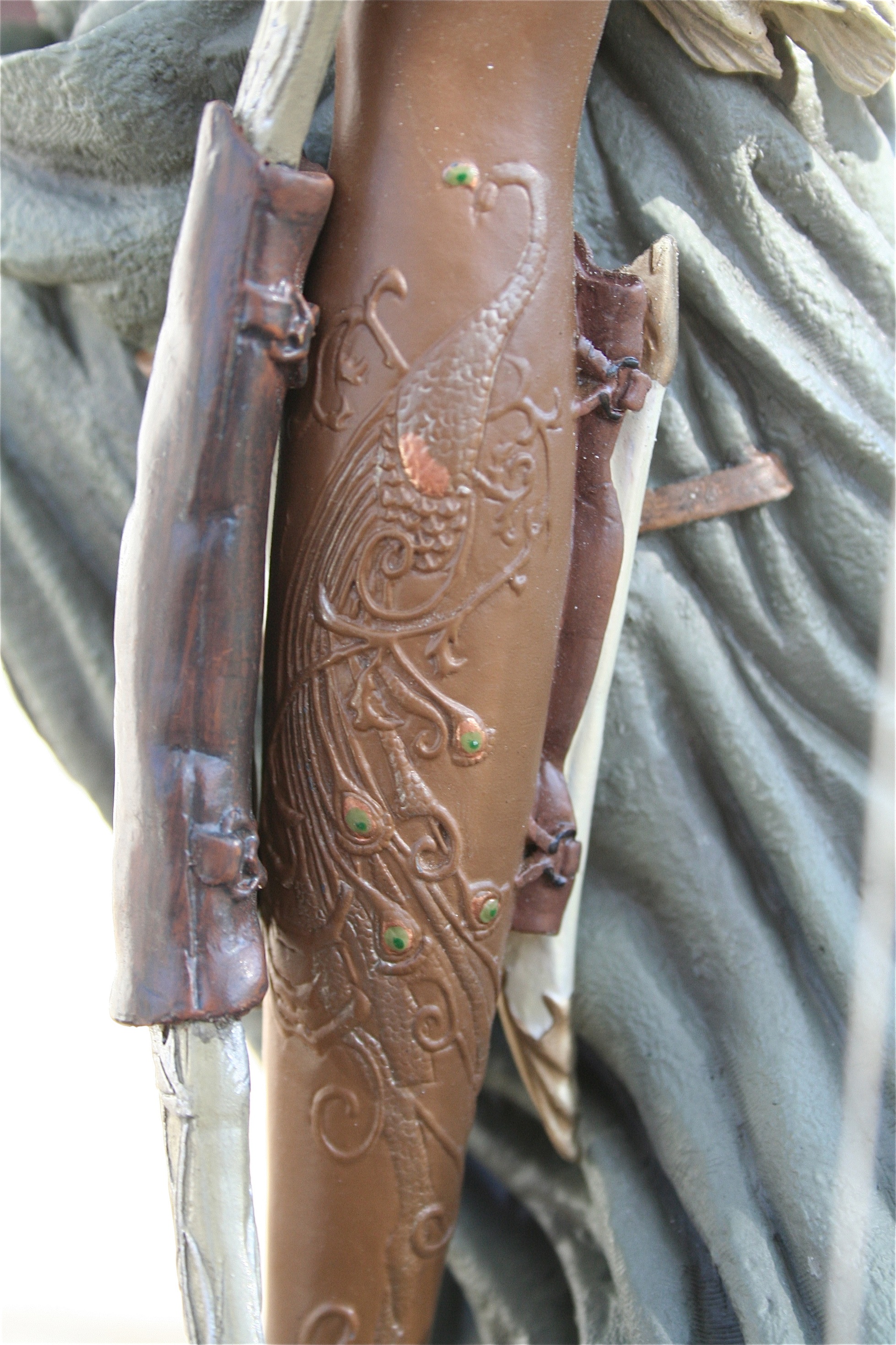 What I love about the detail captured in the outfit of this piece is that it’s the gear from Helm’s Deep. This particular look has only been captured previously in a Legendary Scale Bust (also instock now) from Sideshow Collectibles so its awesome to have a full statue of this look. The leather shoulder pauldrons look like they are leather. Another very impressive thing about the pauldrons is the details in them capturing the elegant stitch work seen in the movie. The rest of the outfit isn’t without eye-catching detail. The mixture of cloth and more leatherwork is no less impressive and when even looked at up close comes across as very well done. Not to be outdone is the arrow quiver with the peacock and how exceptional it looks.