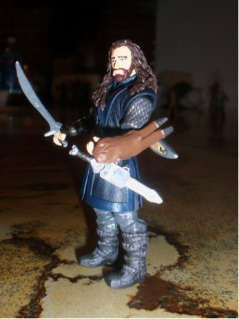 “Fili and Kili, at your service!” The youngest Dwarven members of Thorin and Company are ready for adventure! Fili comes with a nice Dwarven hammer, twin blades that look like machetes, and a sheath on his back that holds the blades nicely. He has the handles of knives sticking out of his forearm armor. Yes, those are just handles. The blades do not come out. He also has throwing axes laced into his boots. They look great, but they are apparently just for show which knocked down my rating of the figure a bit. Kili comes with a quiver that holds his bow, arrows, and sword on his back. Like Fili, he has a knife attached to his quiver that is just for show. The sleeves of his coat make it difficult to get his elbows to bend so there may be some fidgeting with them in order to achieve this. His boots are dirty, which does give the figure some additional character. Both of these figures suffer from the shirt mail getting in the way of their leg mobility.