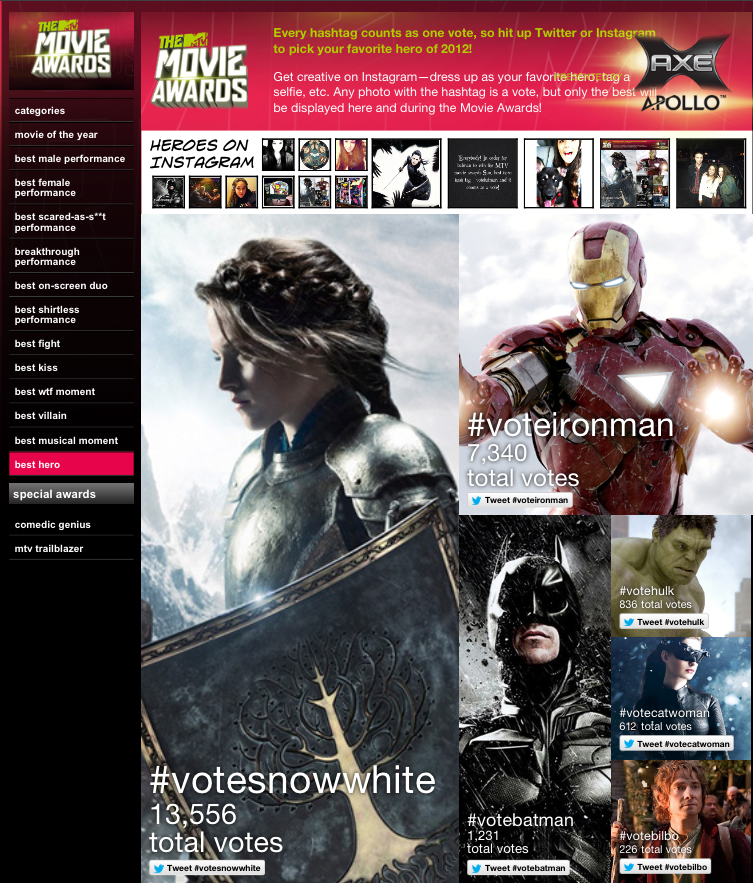 HUNDREDS OF THOUSANDS OF VOTES POURED IN DAILY. When the final weekend of the Awards telecast began on April 13th, we broke 1 million votes. K.Stew voters were trying to keep up; sometimes we crossed above or below their high-end total. Fans started to create one-click Twitter vote buttons, and we supplied a host of #VOTEBILBO avatars and funny images to become viral memes. Fans started creating their own images (with familiar LOLcat fonts) and sharing them.