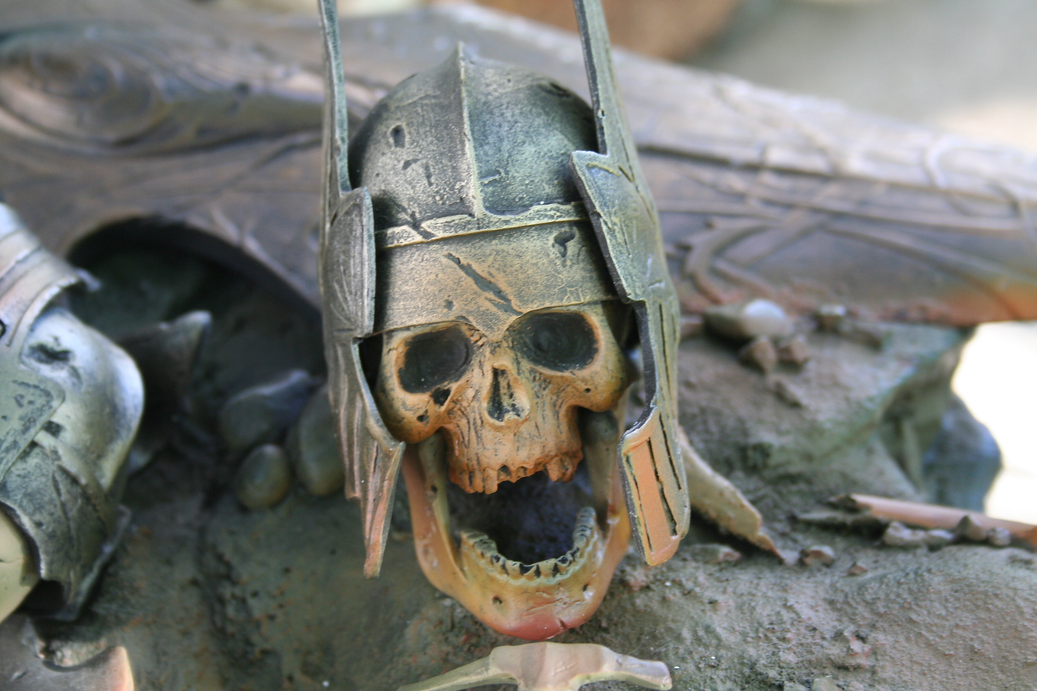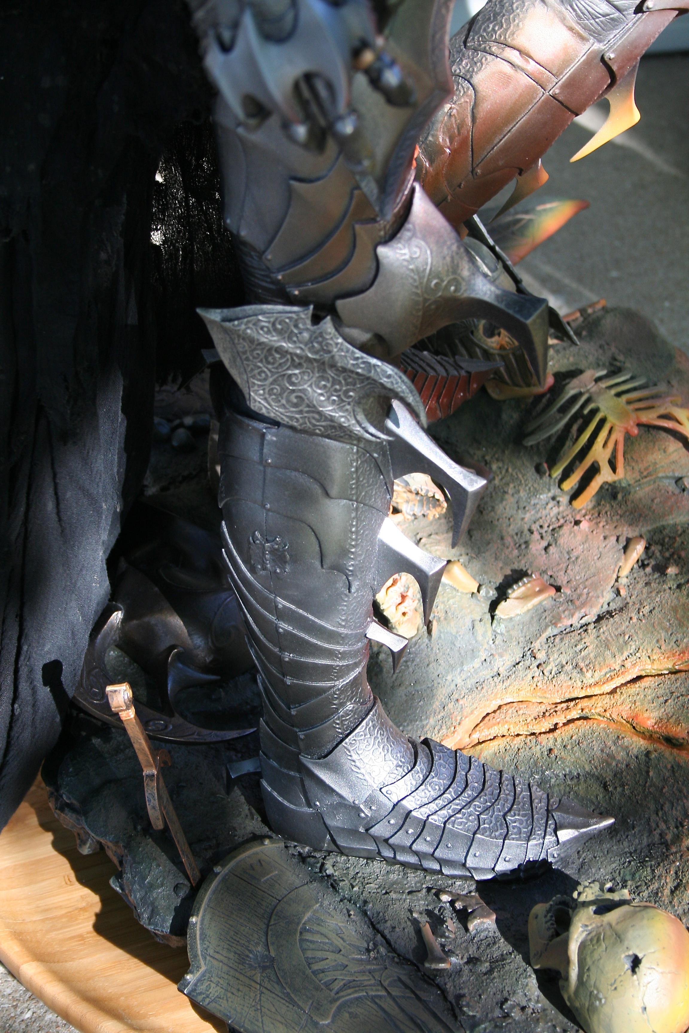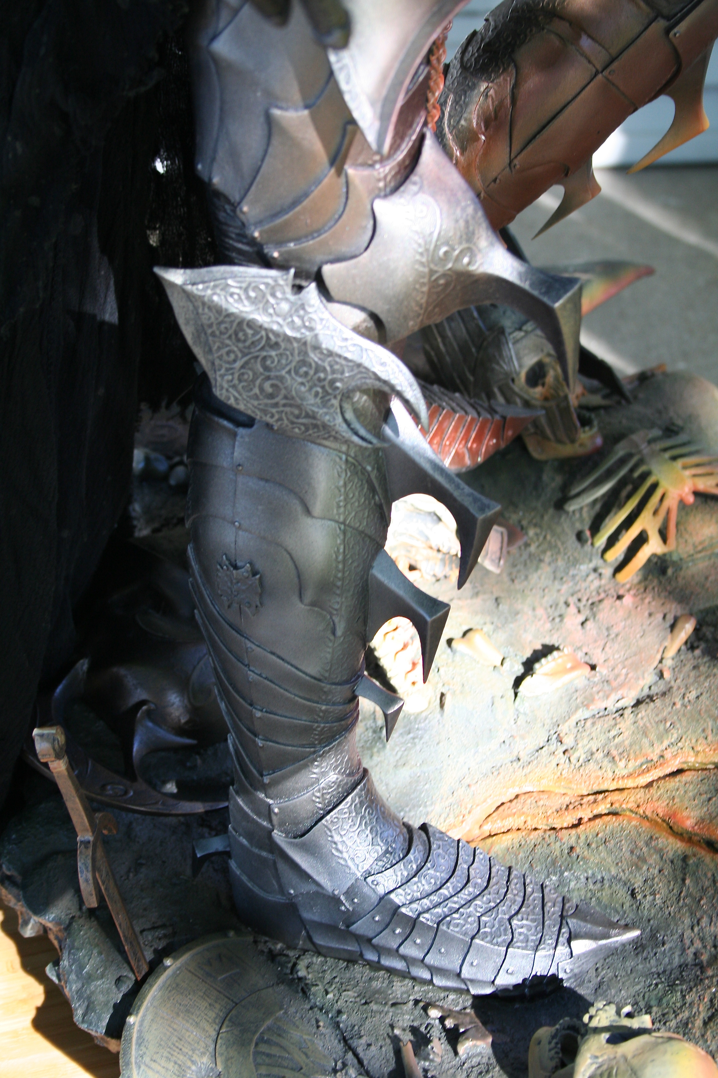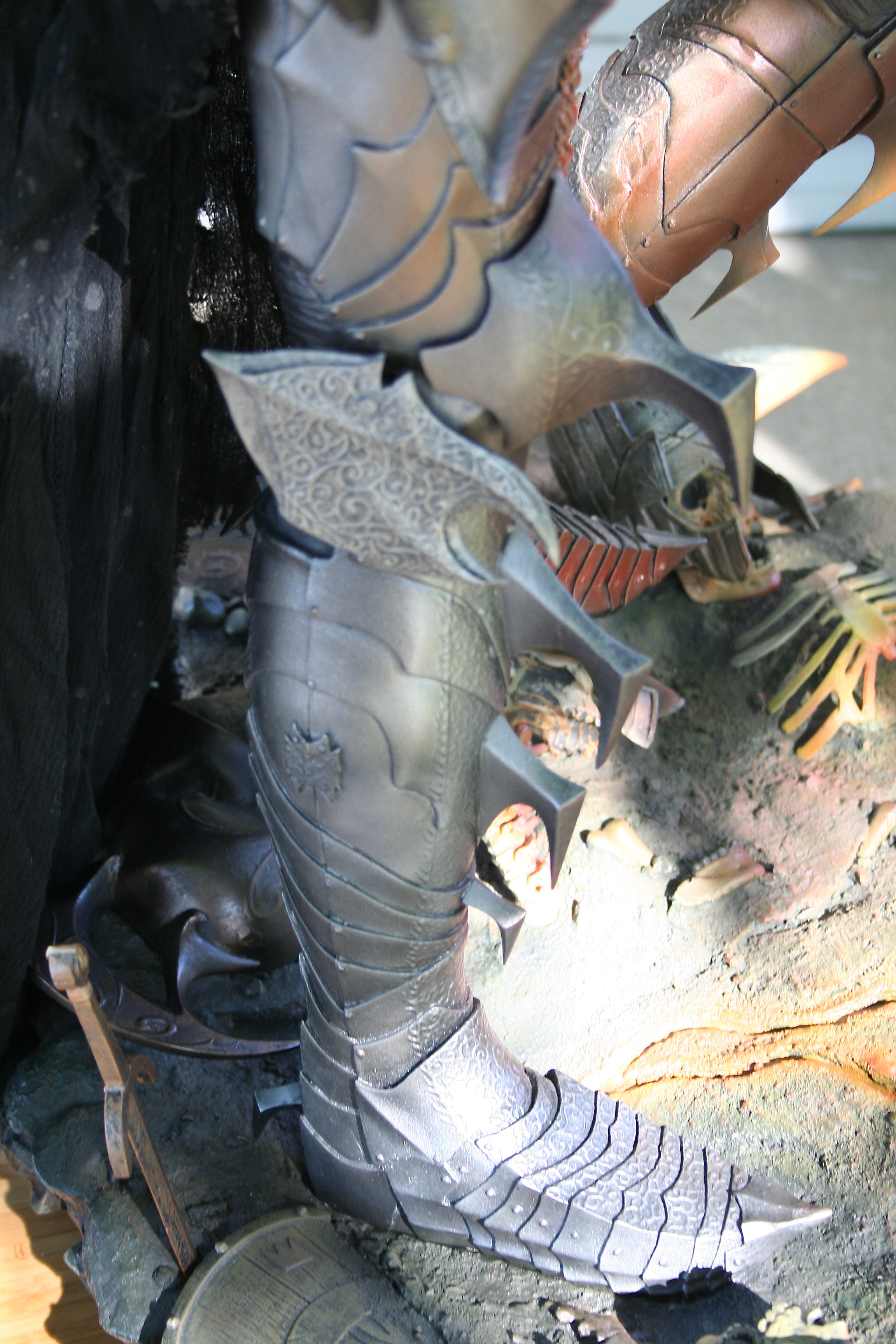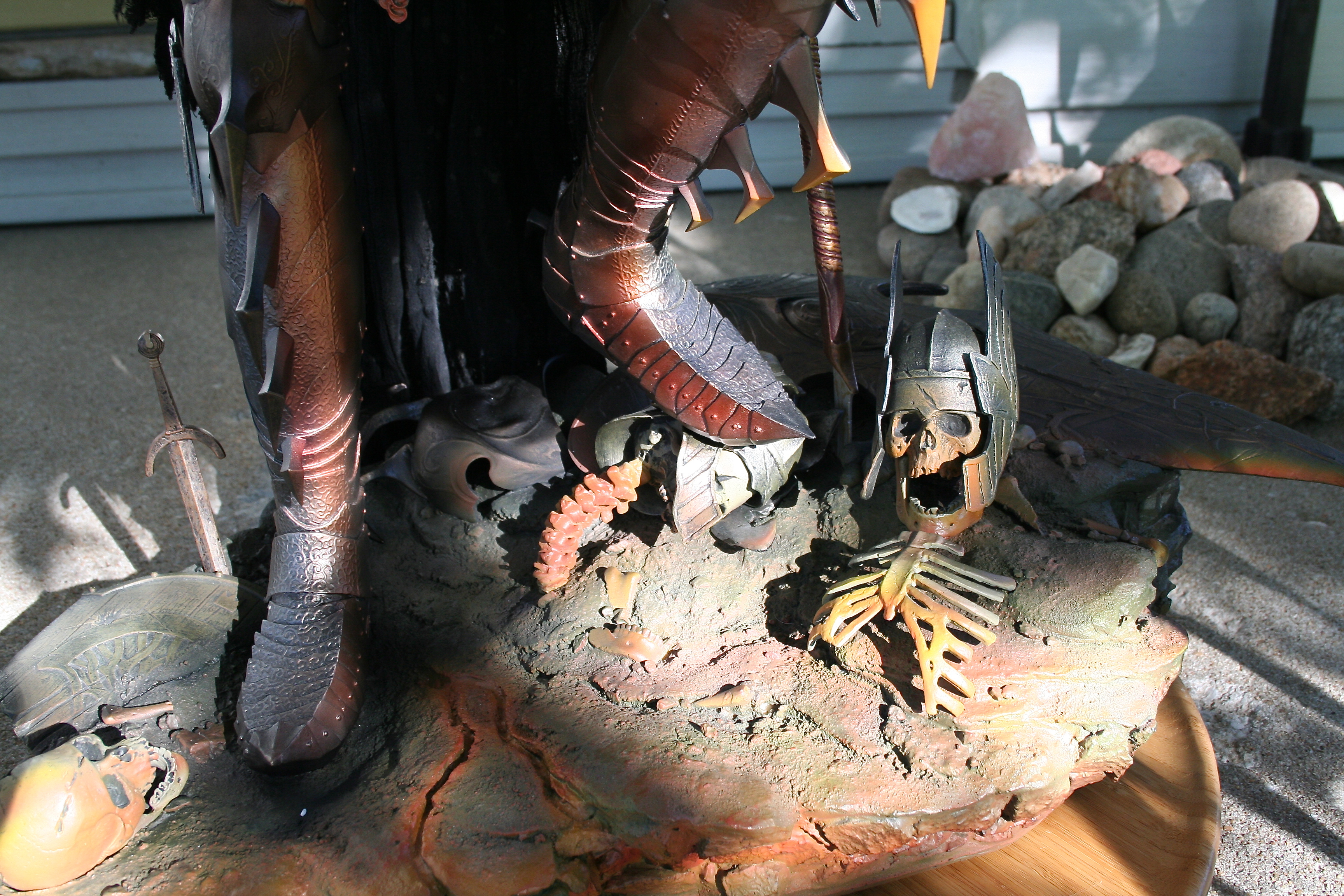 Skulls, shields, helms, and even the rock and earth base all have the incredibly aged and worn look you’d expect in Mordor. The skulls are yellowed with passing of an entire Age. The helmets, shields, and swords all have a great metal/wood look to them while also looking appropriately pitted and worn. Then, of course, you have to nail the color of Sauron‘s armor and match it with both the movie and Jerry Vanderstelt’s art print. I believe this was done in spades and it absolutely matches what we know Sauron’s armor to looked like. The armor has the proper mix of clean metal and dirty-looking metal and is especially close to the vision of the art print.