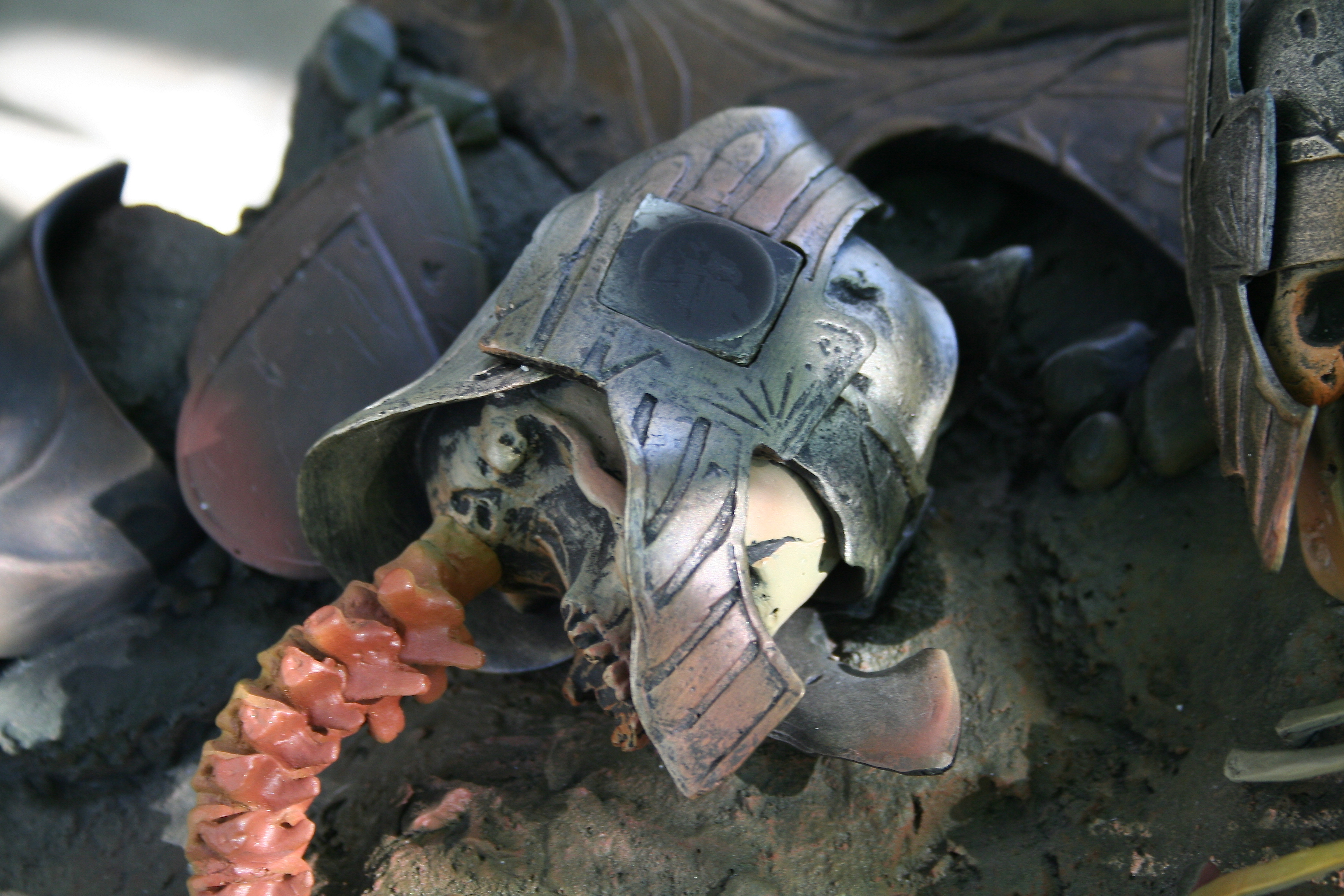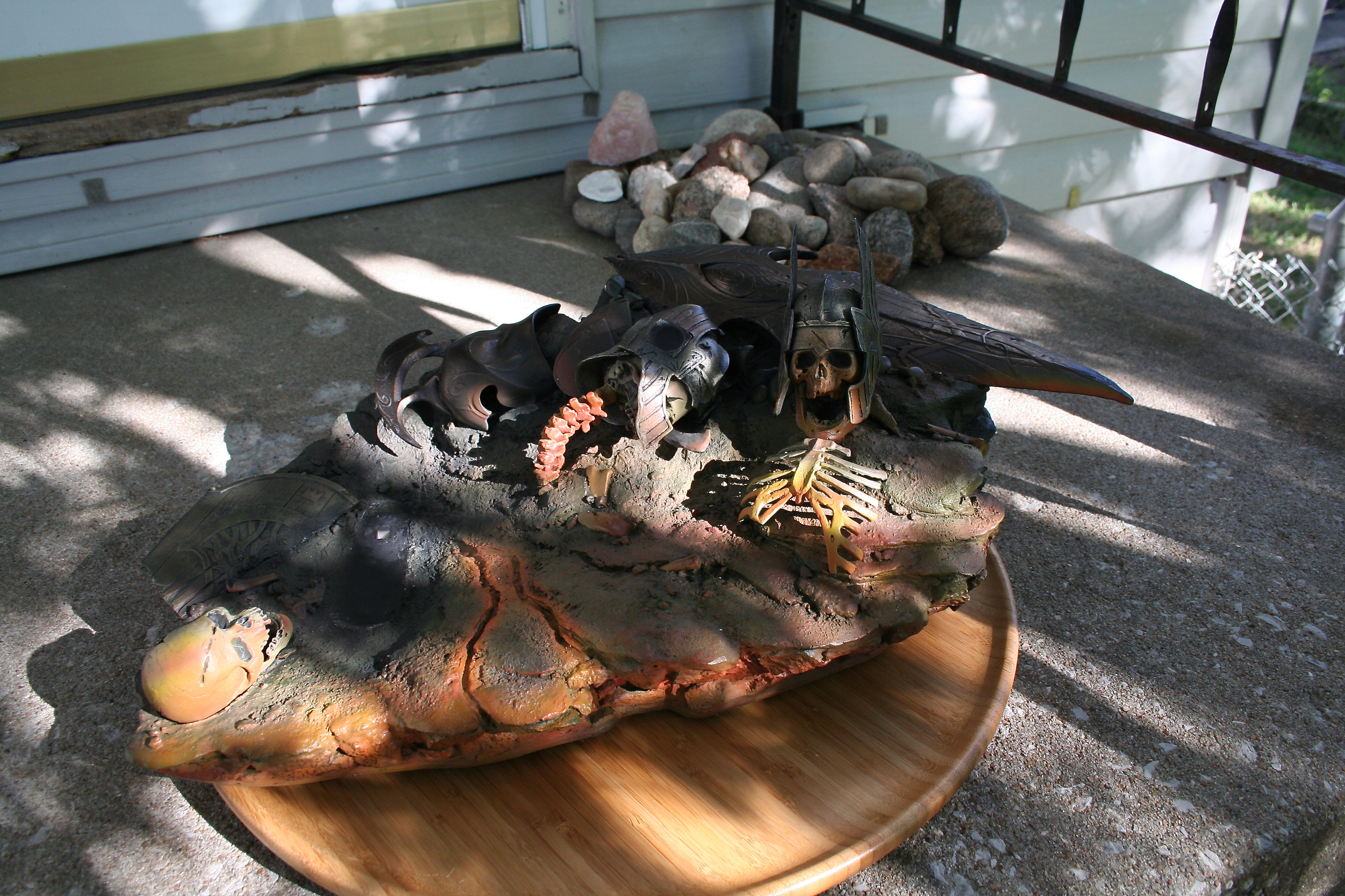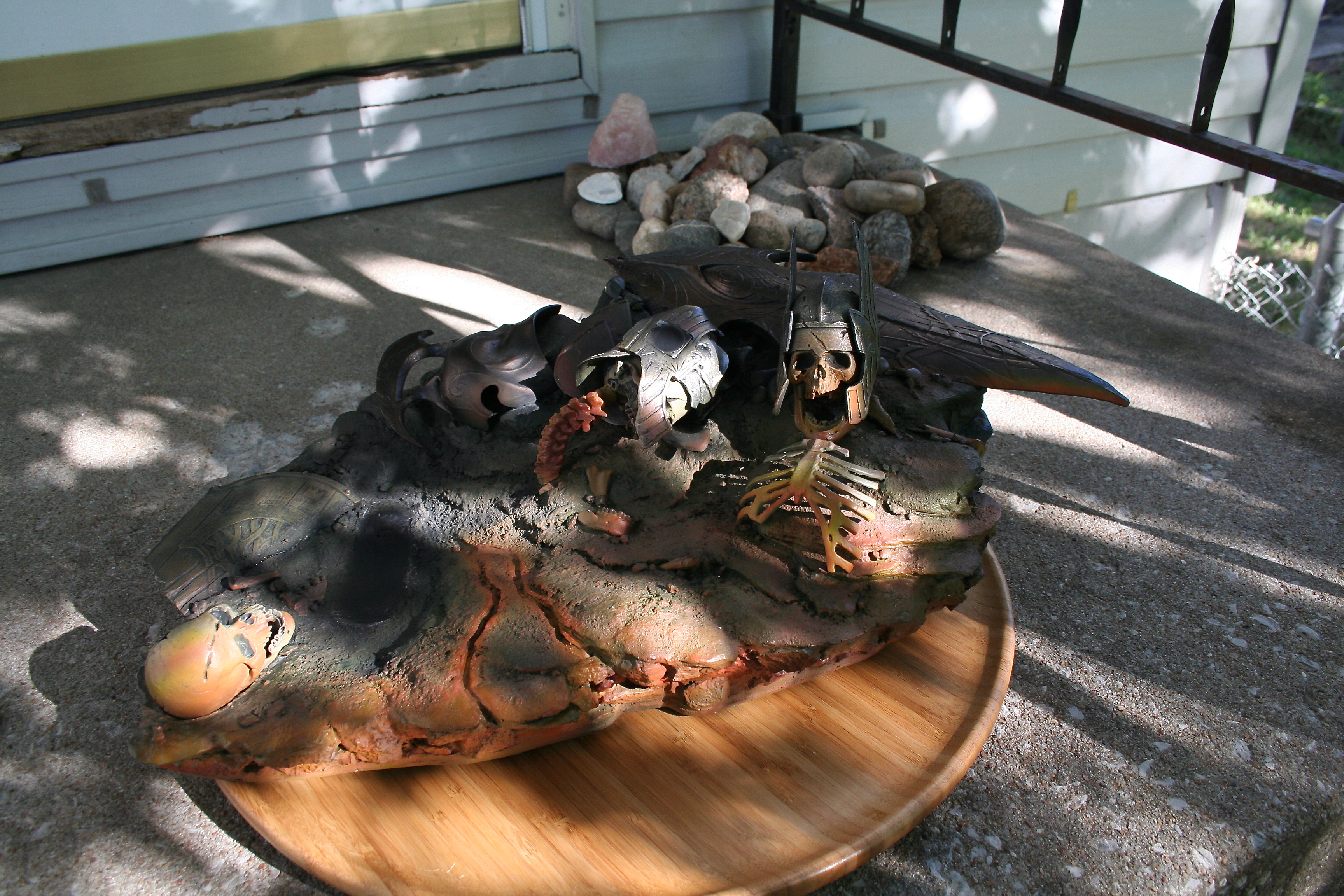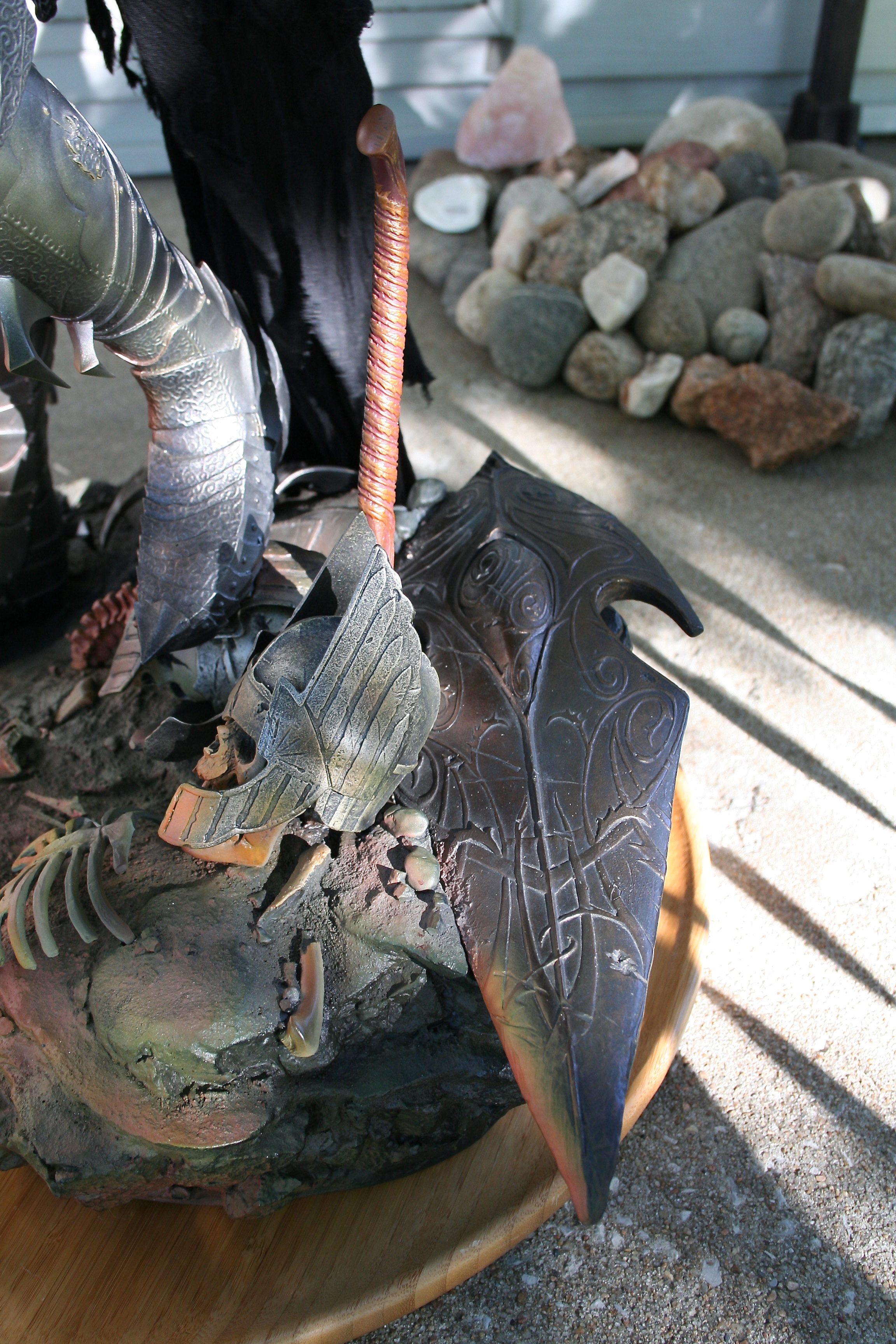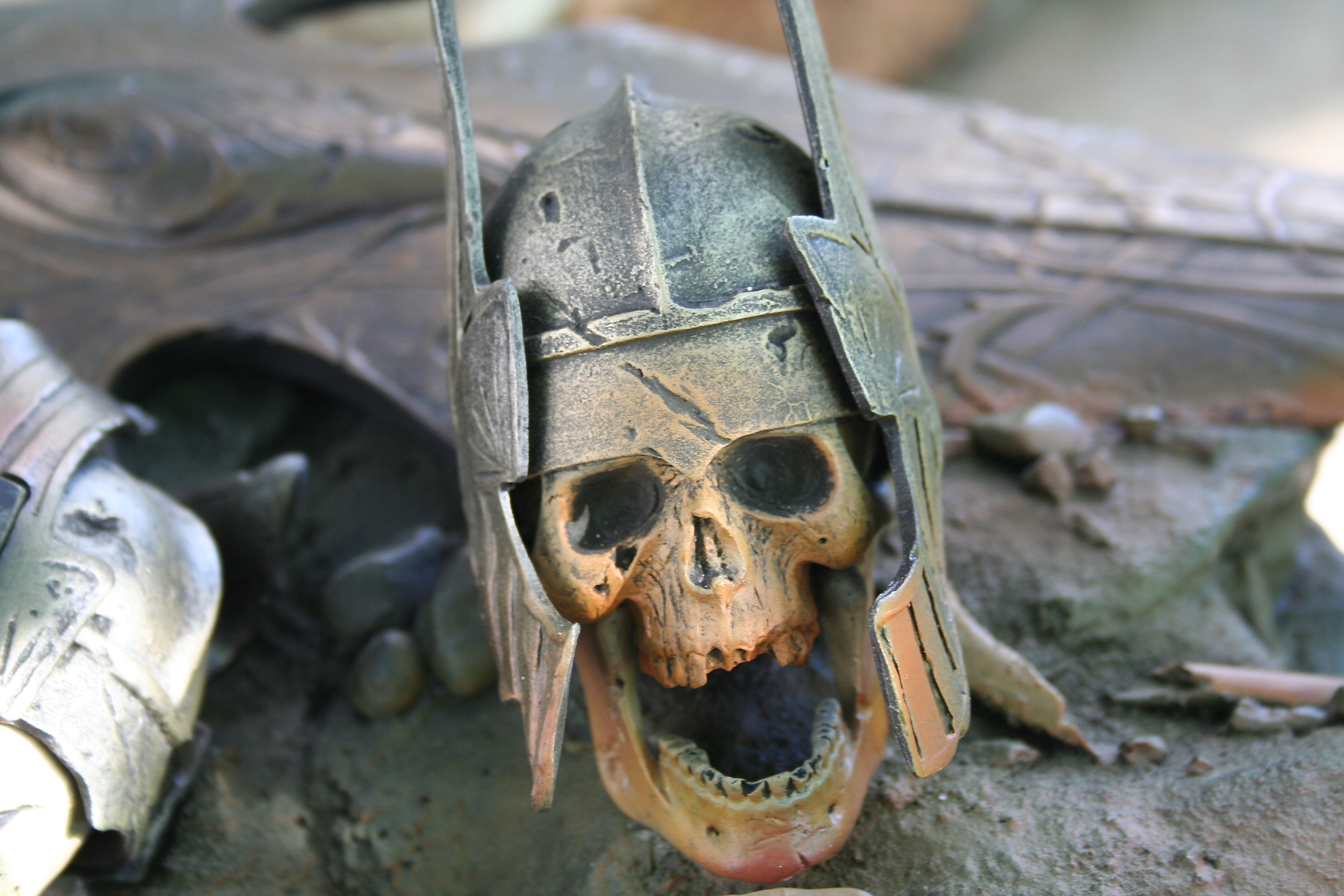 Skulls, shields, helms, and even the rock and earth base all have the incredibly aged and worn look you’d expect in Mordor. The skulls are yellowed with passing of an entire Age. The helmets, shields, and swords all have a great metal/wood look to them while also looking appropriately pitted and worn. Then, of course, you have to nail the color of Sauron‘s armor and match it with both the movie and Jerry Vanderstelt’s art print. I believe this was done in spades and it absolutely matches what we know Sauron’s armor to looked like. The armor has the proper mix of clean metal and dirty-looking metal and is especially close to the vision of the art print.
