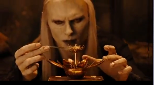 Like Fëanor, Nuada is a fierce fighter. His superb sword play and athleticism is on full display in Hellboy II, thanks to actor Luke Goss. He demonstrates great skill with both swords and spear. The latter is magical, capable of lengthening at Nuada’s command, and if the tip of it is broken off in an enemy, it works its way toward the victim’s heart. He also evidences skill as a smith. We see him constructing a device to hold the seed of a forest elemental. And as one might expect of an elven smith, he seems impervious to heat when he recovers a metal cylinder from flames with his bare hand.