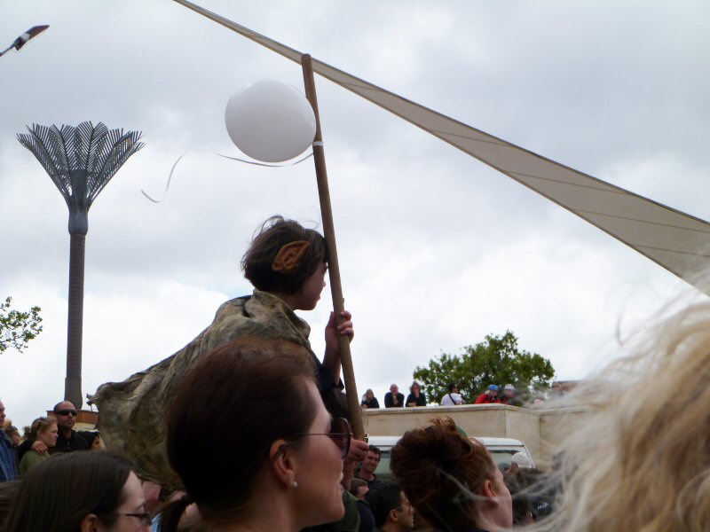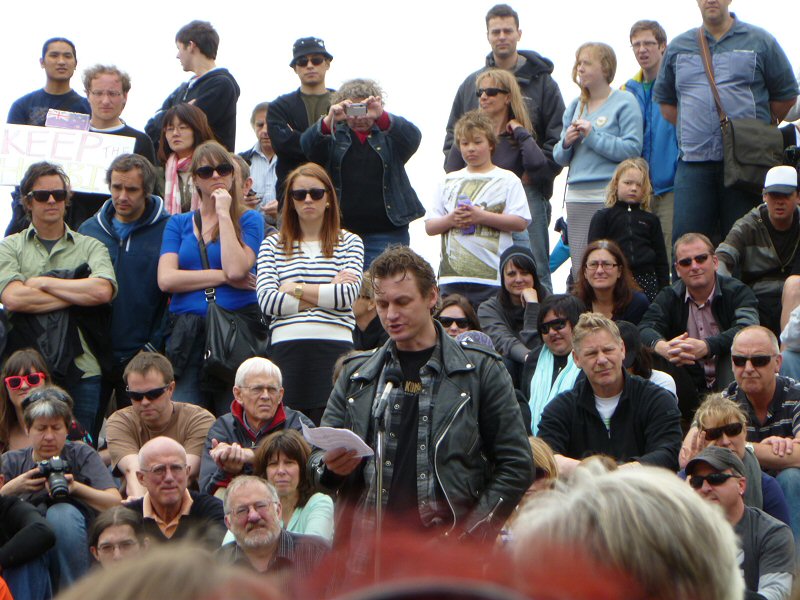 Next up was Richard Taylor, who gave a wonderful speech about the importance of the New Zealand arts community, and how very much The Lord of the Rings means to this country. Once he passed on Peter Jackson’s and Fran Walsh’s apologies for not being at the rally (because they are understandably quite busy just now), Richard read a really lovely letter from the two of them, thanking everyone for coming, for supporting the film industry, for being part of the making of LotR, and for being fans. There was a little dash of politics in the letter as well, primarily regarding the wisdom of allowing other countries to control the workings of New Zealand itself, but the primary message was a positive one.