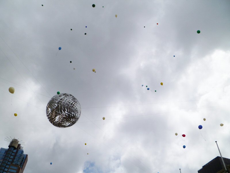 I arrived at a quarter after 12, while everyone was still slowly filtering in. Right off the bat, it was clear that this was going to be a positive event, as I saw many a smile as people drifted across the square, greeting friends, finding spots to stand or sit, and snapping pictures. It could not have been even a full ten minutes before someone offered me a balloon; the square was full of them, brightly coloured and bobbing along to the beat of music playing from the loudspeakers near the City-to-Sea Bridge.