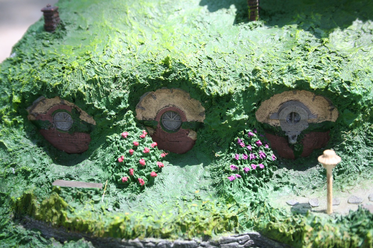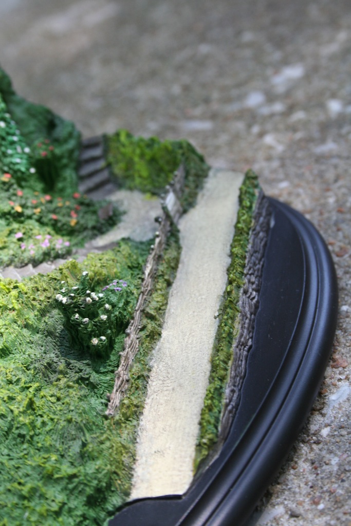 David Tremont, Shari Finn, and Daniel Cockersell are the three individuals responsible for the exceptional detail put into this environment. The beauty of this piece is the ability to feel its been pulled from the screen and placed into your collection. Initially the big Tree draws you to the piece and the level of detail put into it very much makes it feel like a real tree. The grass very much gives you the look of grass that you see in the movie or out in your yard along with the really well done flowers around Bag End. This to me is amazing considering the scale of the piece and shows the talent that these two sculptors posses. Then you have the detail added to each window in order to reproduce the look from Bag End on screen. Within those windowsills you can also see what’s meant to be small bricks and much like the flowers at this scale they give a real look to the overall piece. Laying outside of that you have some very well done garden pots and the most amazing aspect of the outside are small pair of garden sheers. You also have detail further out with items like the fence and the sign that lets people know about “no admittance except on party business.”