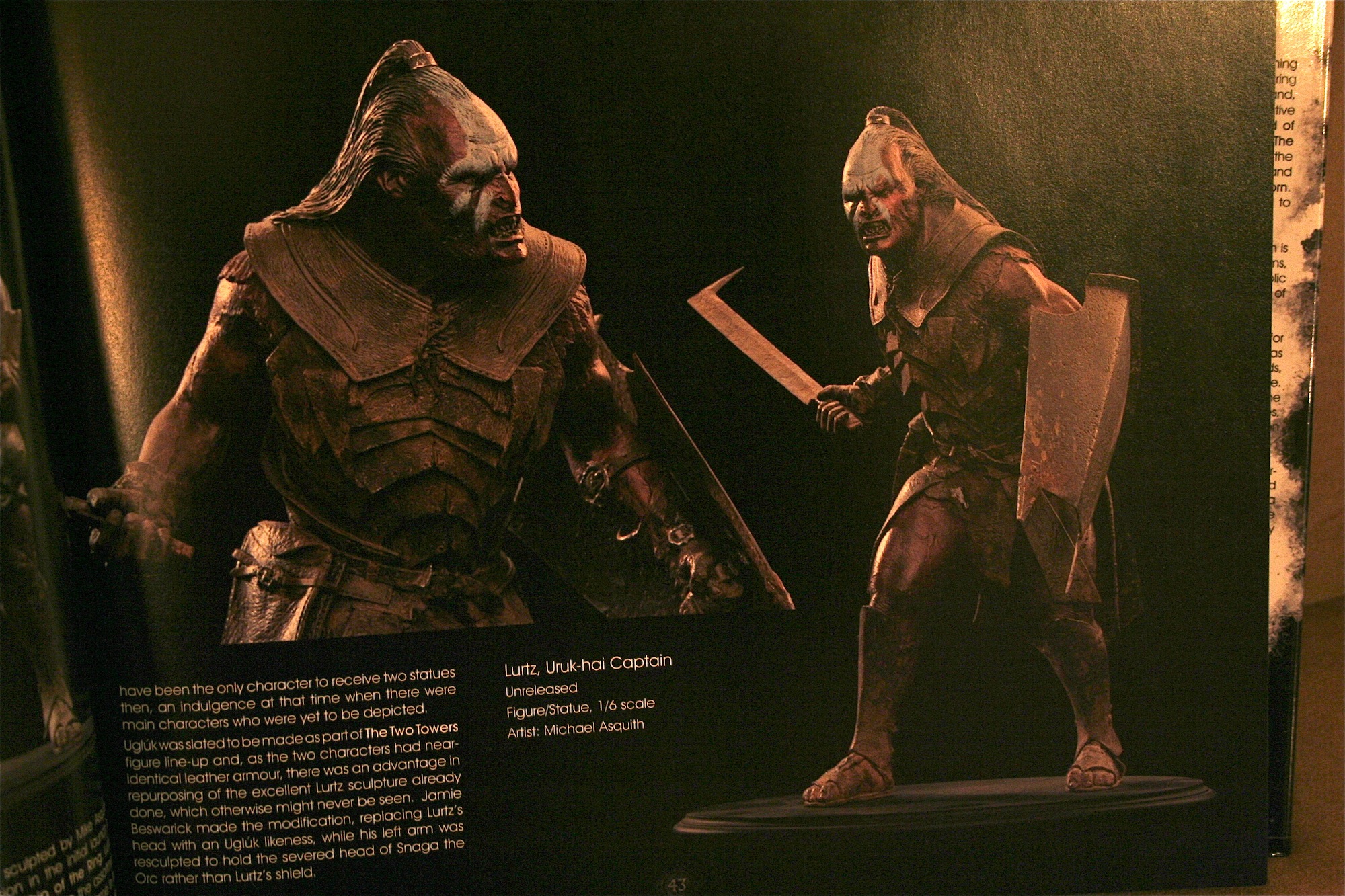 Within The Lord of the Rings section we get so much information about pieces we saw and pieces we never got a chance to own. Details as to why the simple black bases were chosen in order make the statues stand out on their own, or that when the Gandalf the Grey statue was created it was with the thought of the other members following the leader. There are countless items like this throughout the book on what went into certain pieces coming out the way they did. We also get a look at items that just never came to be which makes one sit and wish they had only to add to the collection. One of the first pieces we get told about is Gwaihir, Lord of the Eagles and we see a small picture the only one in existence mind you of what this piece may have looked like. Lurtz one of the