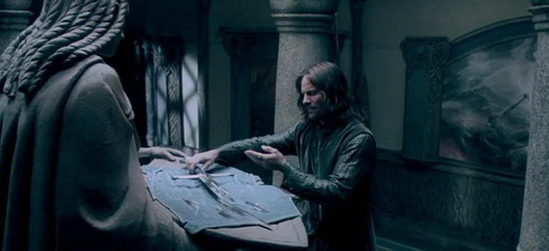 maegwen: Our communities were arguing about this, but there isn’t an argument to be made. Despite a change in perspective — and in time of day — it is positive that this scene takes place within the same room in FOTR where Aragorn encounters Boromir, and later converses with Arwen. Judging by the mural/painting on the wall and the statue cradling the shards of Narsil, it is unlikely that a different location would be created that so closely mimics the other. It’s a nice bit of continuity between the films.