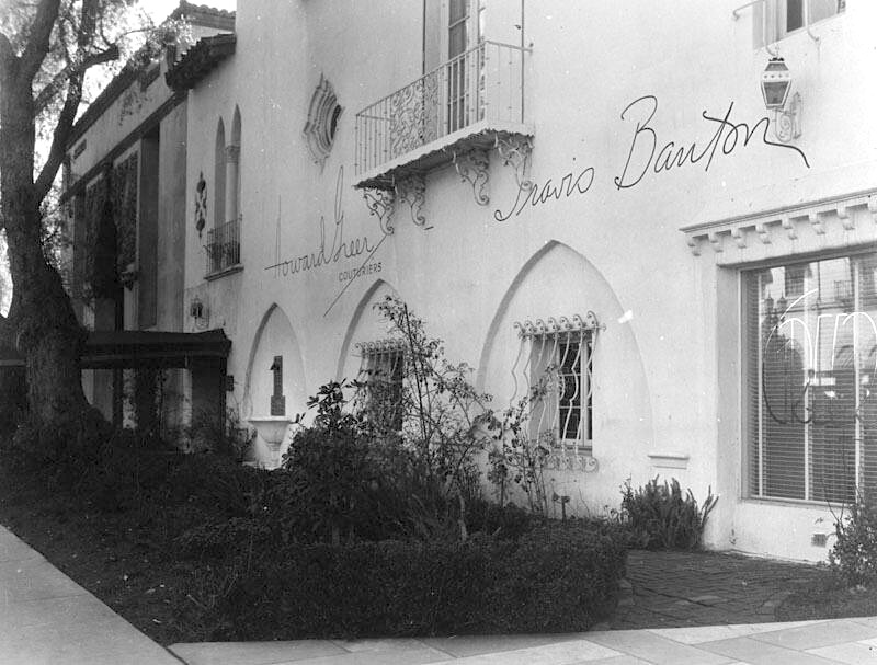 Long before there was a restaurant at 6530 Sunset Blvd., there was a Spanish Shopping Court built by Fred Thompson, housing numerous shops including Travis Banton’s dress shop. Banton, the chief costume designer at the time for Paramount Pictures, was one of the most important Hollywood designers in the 1930’s. Fred Thompson was both a famed Western acting star with Paramount Pictures, as you can see in the photo above on the left, and was a leading business man in Hollywood, with the Thompson Building being one of his lasting legacies.
