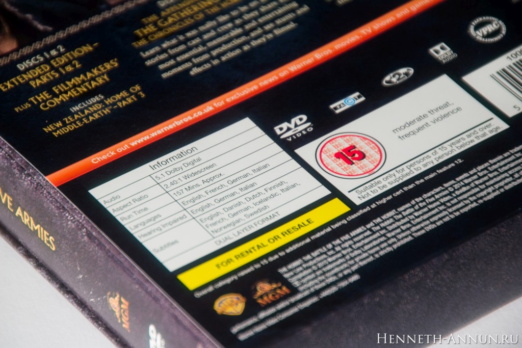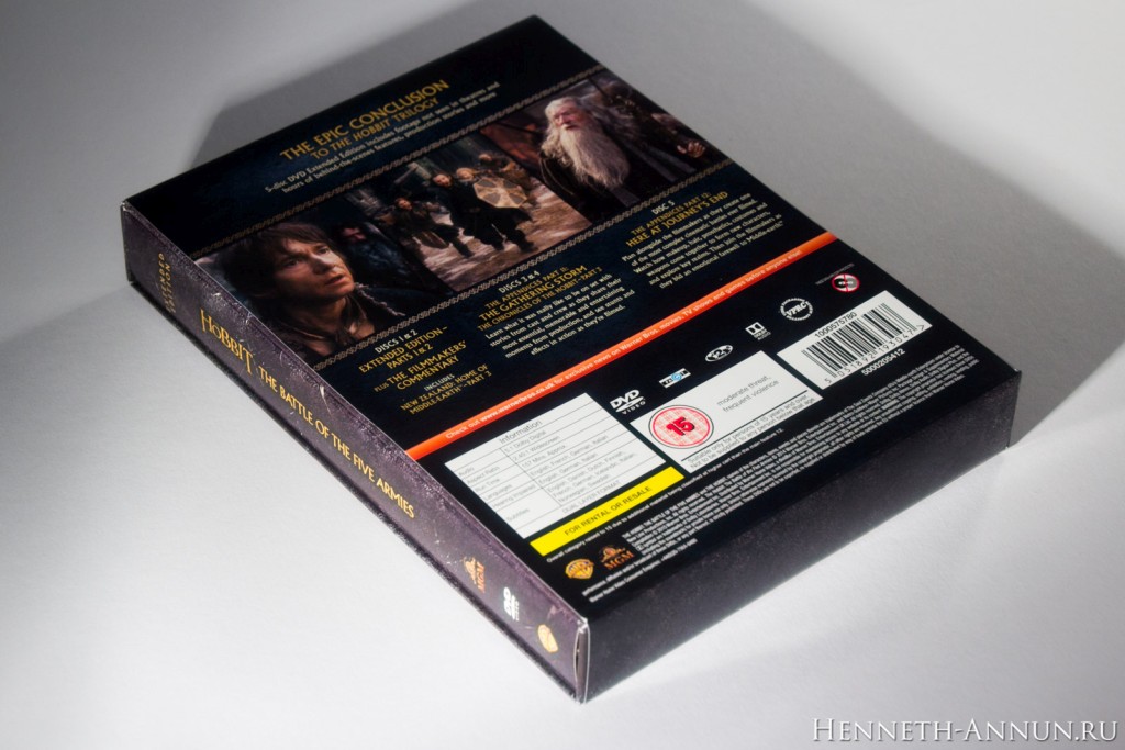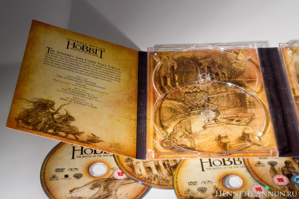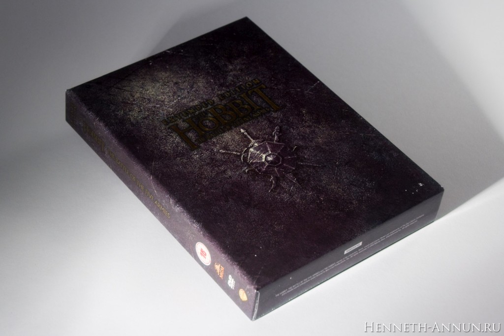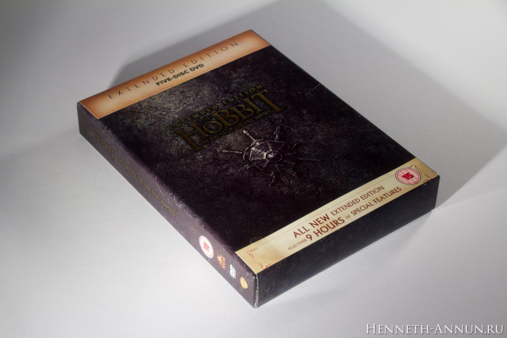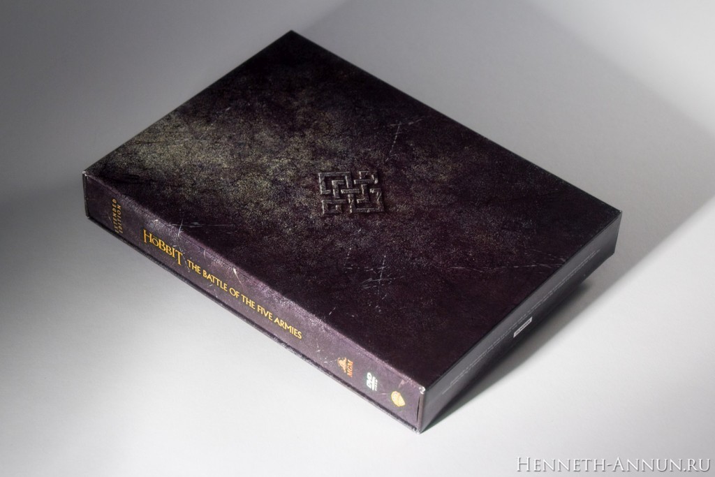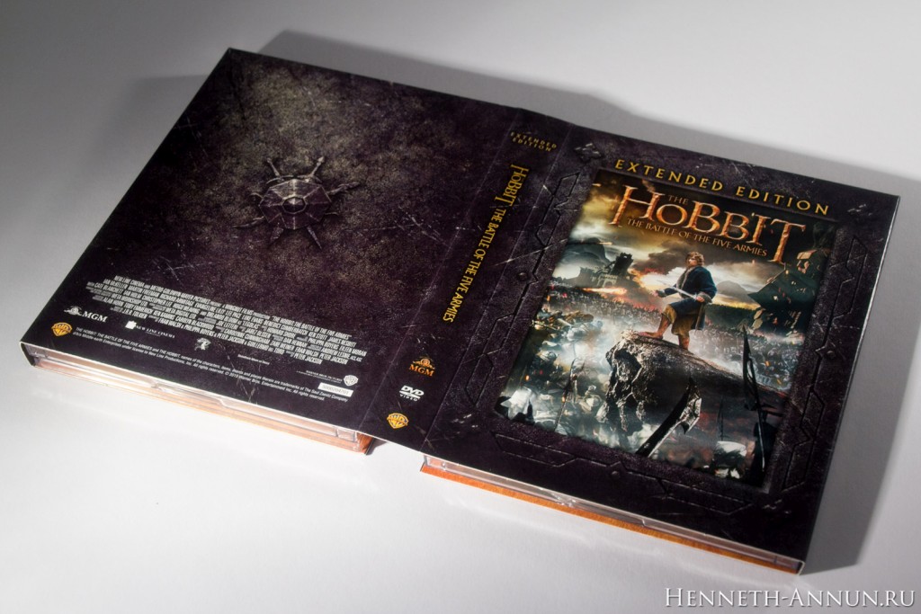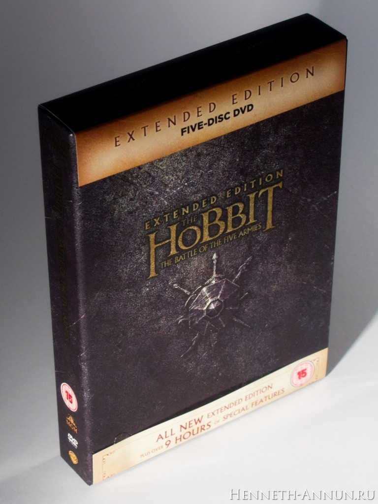 Hands-on review: The Hobbit BOTFA SEE (UK DVD) In the time of iTunes, digital copies and online streaming, it is quite a challenge to create a traditional home video release, especially if it has to have some appeal to collectors. One of the things that digital copies don’t provide is the feeling when taking a physical disc into your hand, or the satisfaction of having nice packaging for a film on your shelf. In this respect, the DVD editions of the Extended Editions of The Hobbit are pleasantly traditional, for (unlike the BluRays) they still have cool-looking covers and a fold-out digipak inside like in the good old LOTR SEE days. And among these DVD editions, the UK DVD version especially sticks out, for it uses a different design than the USA as well as most European countries: instead of a Photoshop collage it contains just the title and a minimalistic symbol, continuing the design tradition of The Lord of the Rings Special Extended Edition DVDs.