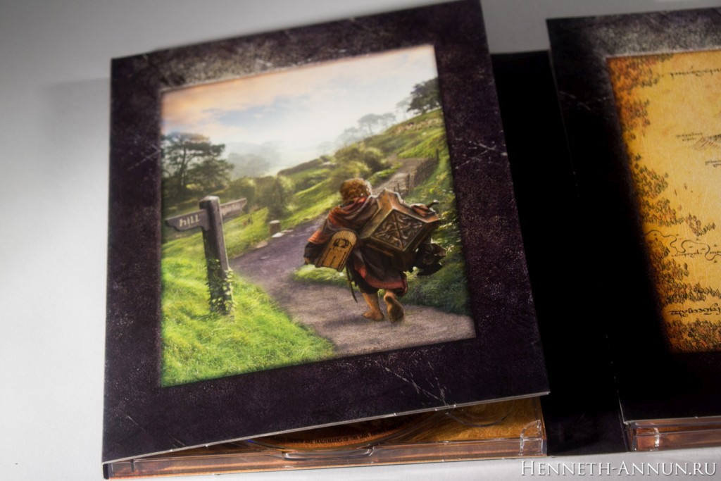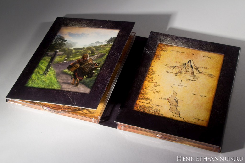 Now for the inner digipak (the cardboard foldout piece with plastic trays for the discs). It contains the same picture as the standard US DVD version. Actually, the inner digipak is the same as in the US version. The back of the digipak contains the same shield and swords symbol (non-embossed though) as well as the movie’s billing. The inner life of the digipak is also in tune with the LOTR SEE digipaks, containing an illustration and a map. The illustration shows Bilbo going Back Again. The map shows the surroundings of Erebor and the Long Lake and is inscribed in Elvish. Now for the inside of the digipak when fold out completely. It has a texture of old parchment and contains wonderful sketches by John Howe and Alan Lee. Unfortunately, there is no booklet. However, a matching fan booklet is already in the making. The discs also have those splendid sketches (unfortunately, there are rather distracting UK and EIRE age rating logos there as well).