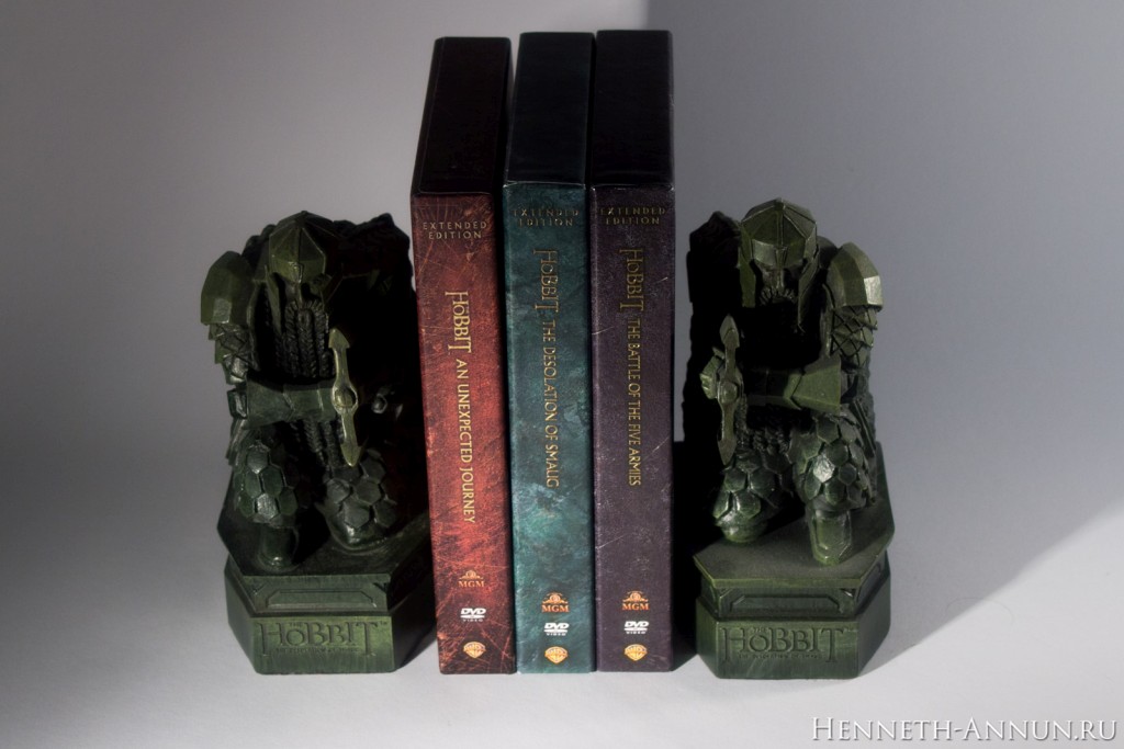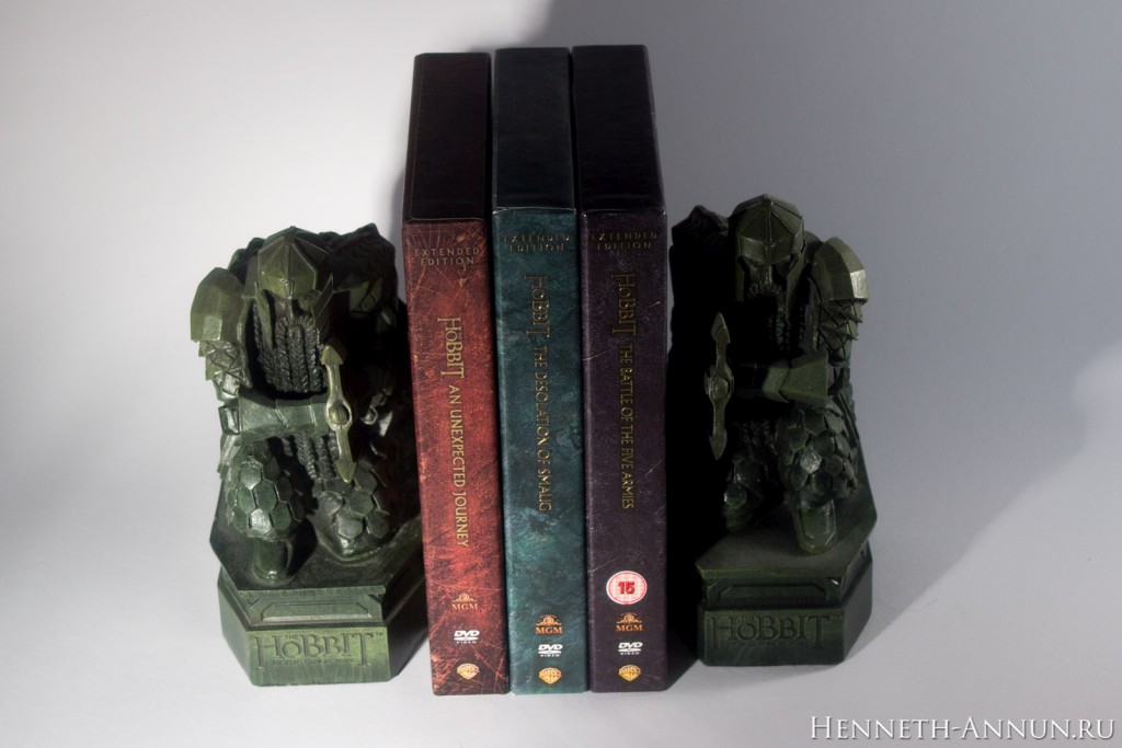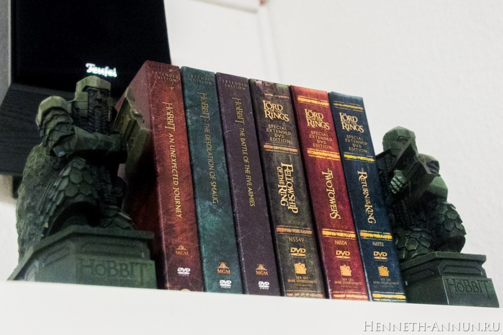 As you can see, the movie’s rating has not changed: it is still rated 12 in the UK. However, the first two bonus discs have been rated 15 in the UK! I think, because of a scene from PJ’s “Braindead” in the bonus. Now that all three films are out, it is time to look how they look together! And the first result is pretty convincing: they do look like they’re cut from the same cloth. Now for the side “shelf compatibility” comparison. Oh-oh, there is a BBFC logo on Film Three! Begone! Fortunately, it can be easily removed. Unfortunately, the title and the logos on the first film do not align properly with the other two films. For collectors suffering from OCD: if you turn the boxes around, it looks much better. And now for the ultimate test: the Middle-Earth Hexalogy on a shelf. Despite the mismatching alignment on AUJ, it still looks pretty good.