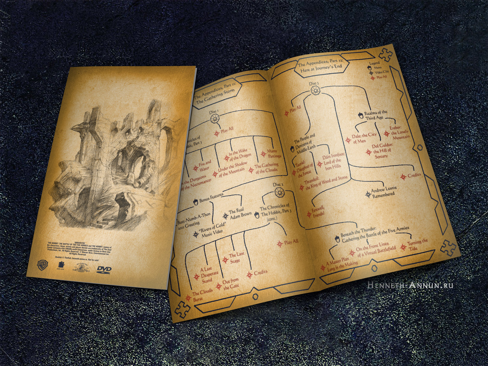 If you recall the times of The Lord of the Rings SEE: each box contained a beautiful little book with parchment-like pages which not only contained stylish pencil sketches by John Howe and Alan Lee, but also held some useful information. Not only was there a chapter list with new and extended scenes specifically pointed out; there was also a navigation help through tons of the bonus materials structured in complex tree-like submenus. Even the BluRay version of LOTR SEE still contained these booklets. Not The Hobbit, however.