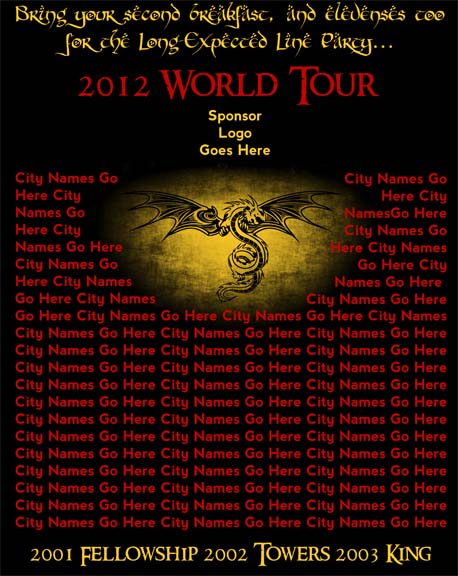 There is something pretty special about banding together with fans in your area and fans world-wide to experience The Hobbit collectively. Following the tradition of Line Party events held a decade ago, our shirt designer Chris Lyons put together a shirt for TheOneRing.net’s fourth party experience. Modeled after a concert tour shirt while still celebrating dragons and dwarves, we want to make this one available to as many attendees as possible. Following tradition, this is our LP4 shirt, following our LP3 shirts from 2003 that we still get requests for and that some members of our staff rarely take off. (We are really hoping they will replace them with these newer, cleaner ones.) The city names on the back will be replaced with actual Line Party cities (join or start a line today!) and we would like to add a corporate sponsor as well. In fact, contact us if you would like to get your brand out to the most die hard fans and have it worn around for a good, solid decade. Our hope is to make these shirts extra affordable and ship in time to wear to the December 13th midnight screenings across the land.