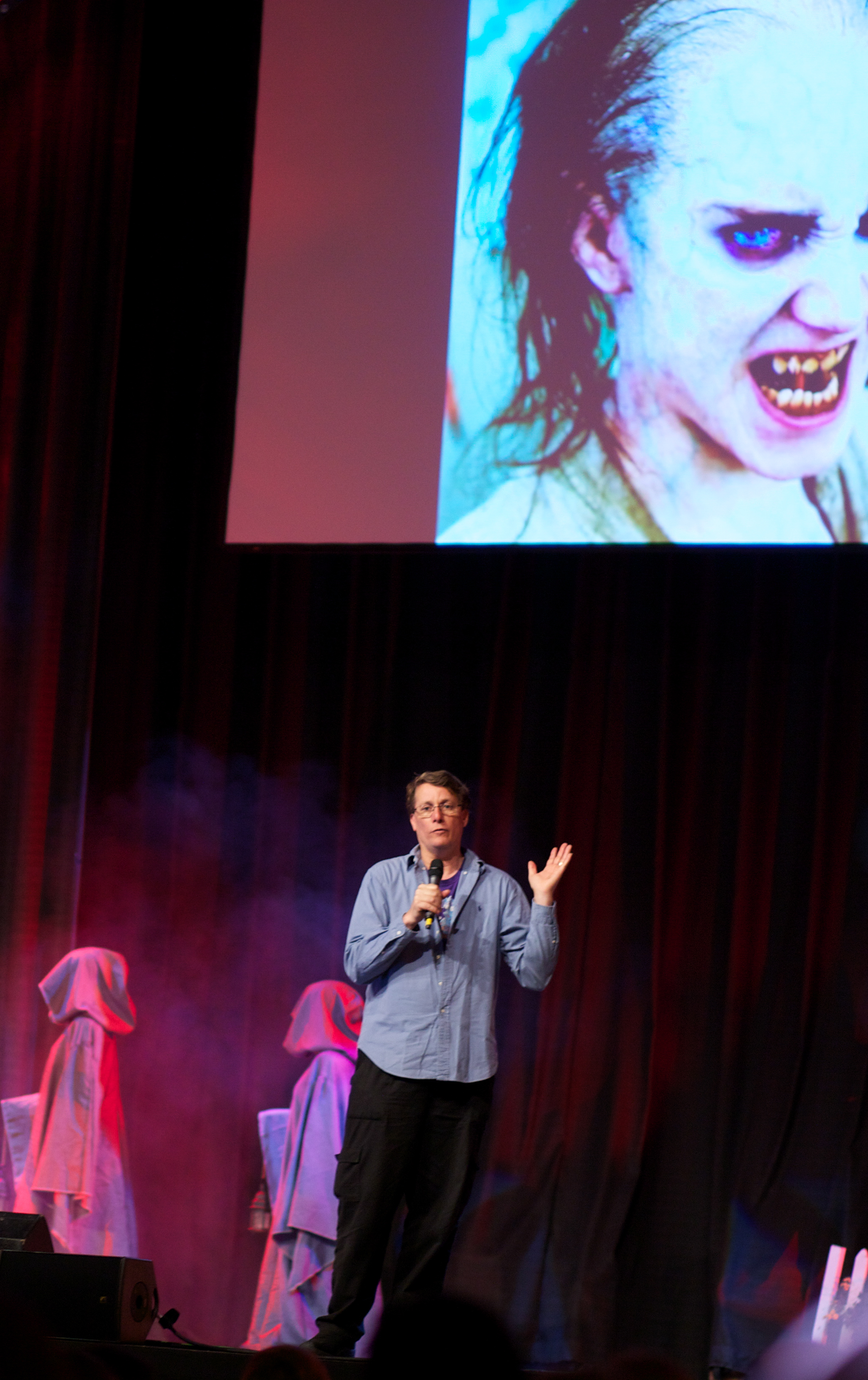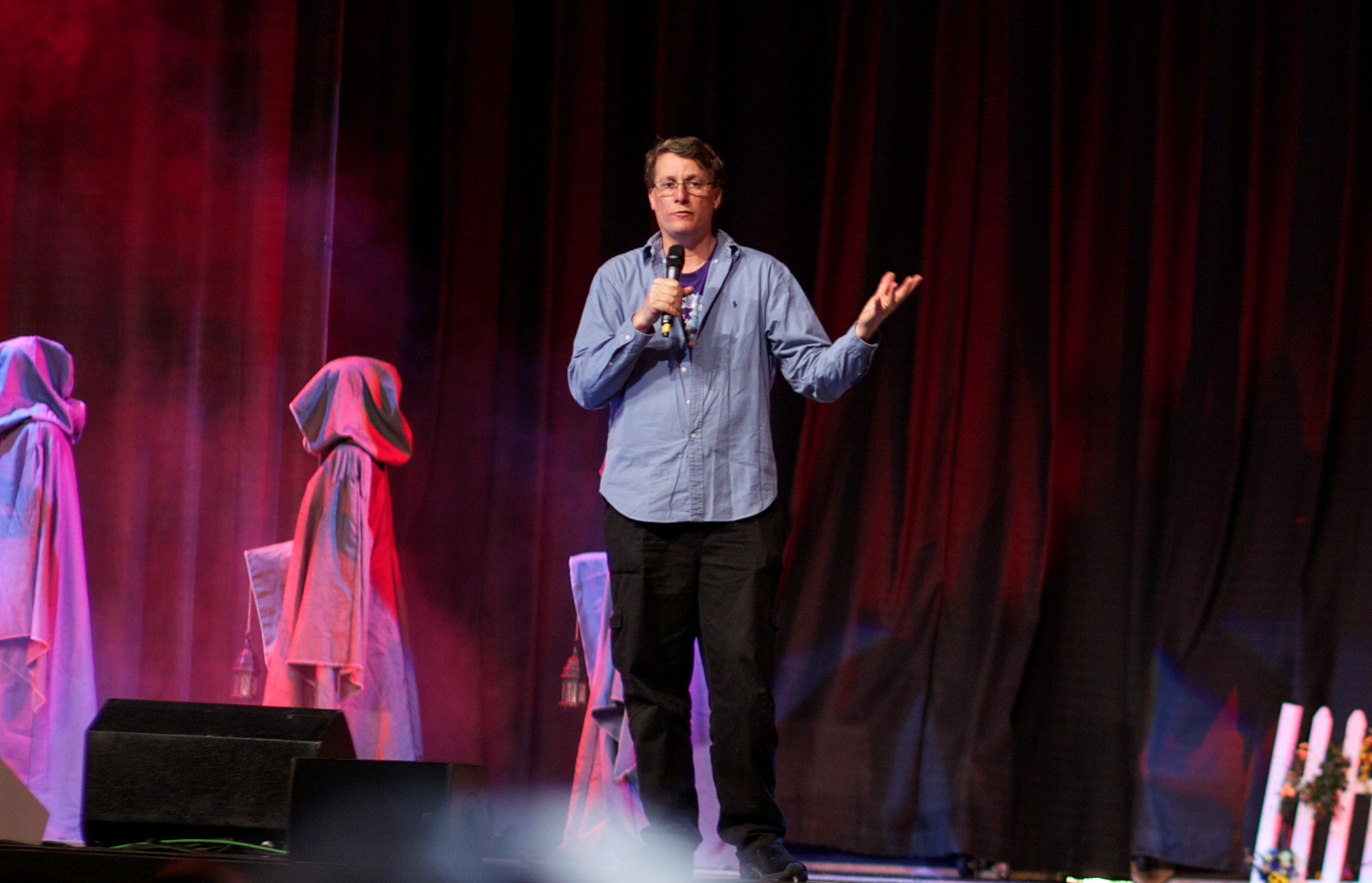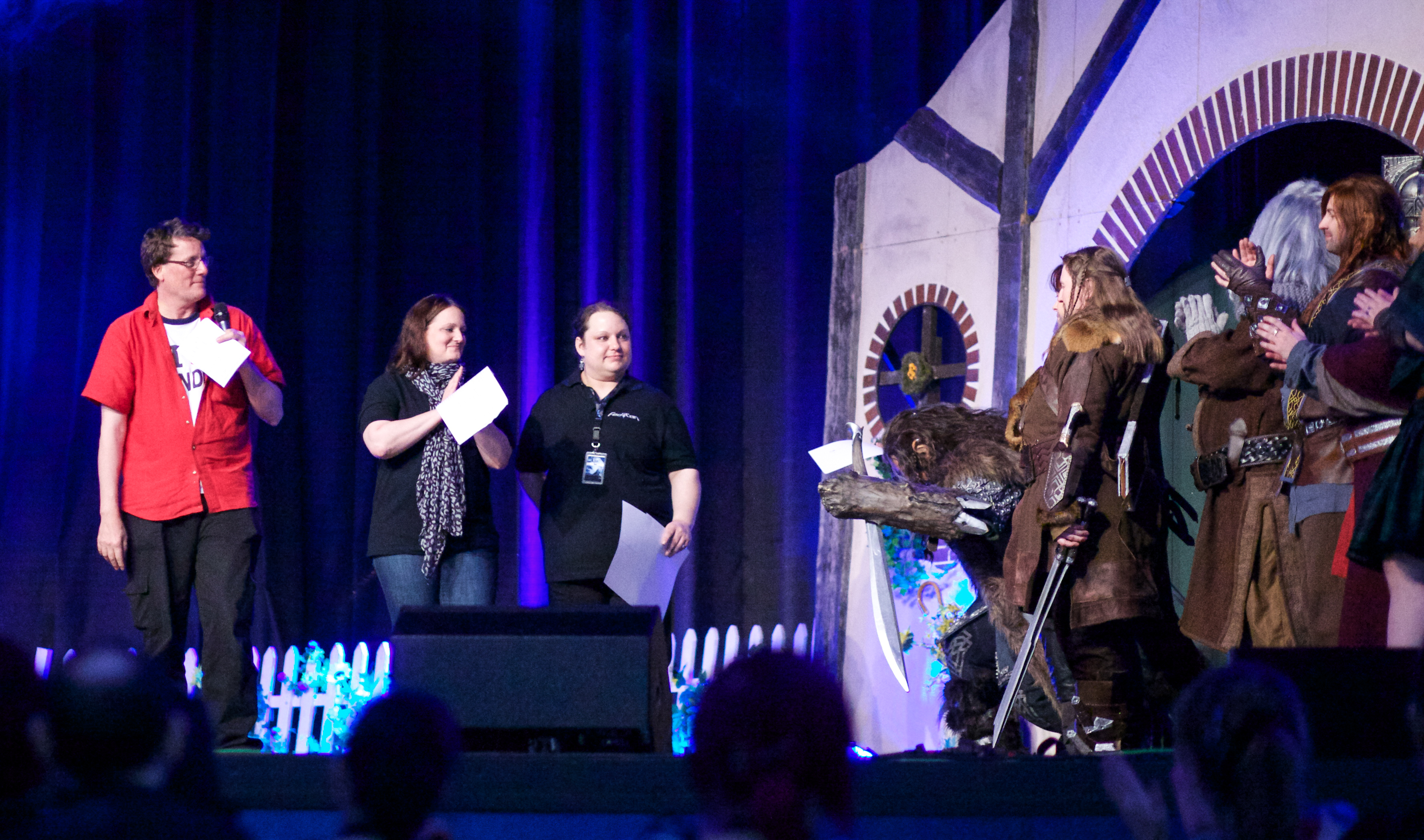 After a very short recess, the Opening Ceremonies began. HobbitCon is hosted by none other than Mr. Mark Ferguson (who you may know as “Gil-Galad” from LOTR). Mark is such a joy and his charisma made the event that much more charming. The sheer spectacle of the opening ceremonies has no rival in the convention world; it is its own animal and is something to truly be marveled at. The stage is filled with ever changing lights, cloaked figures, a large screen for better viewing of the speakers, and even a to scale Hobbit hole! After Mark did his introduction he introduced each speaker and panelist, the people who ran the various workshops and ended with introducing the events cast of characters who were met with boisterous applause from the audience who was on their feet cheering in excitement. Ken Stott received the loudest cheers from the fans, it was his first ever convention!