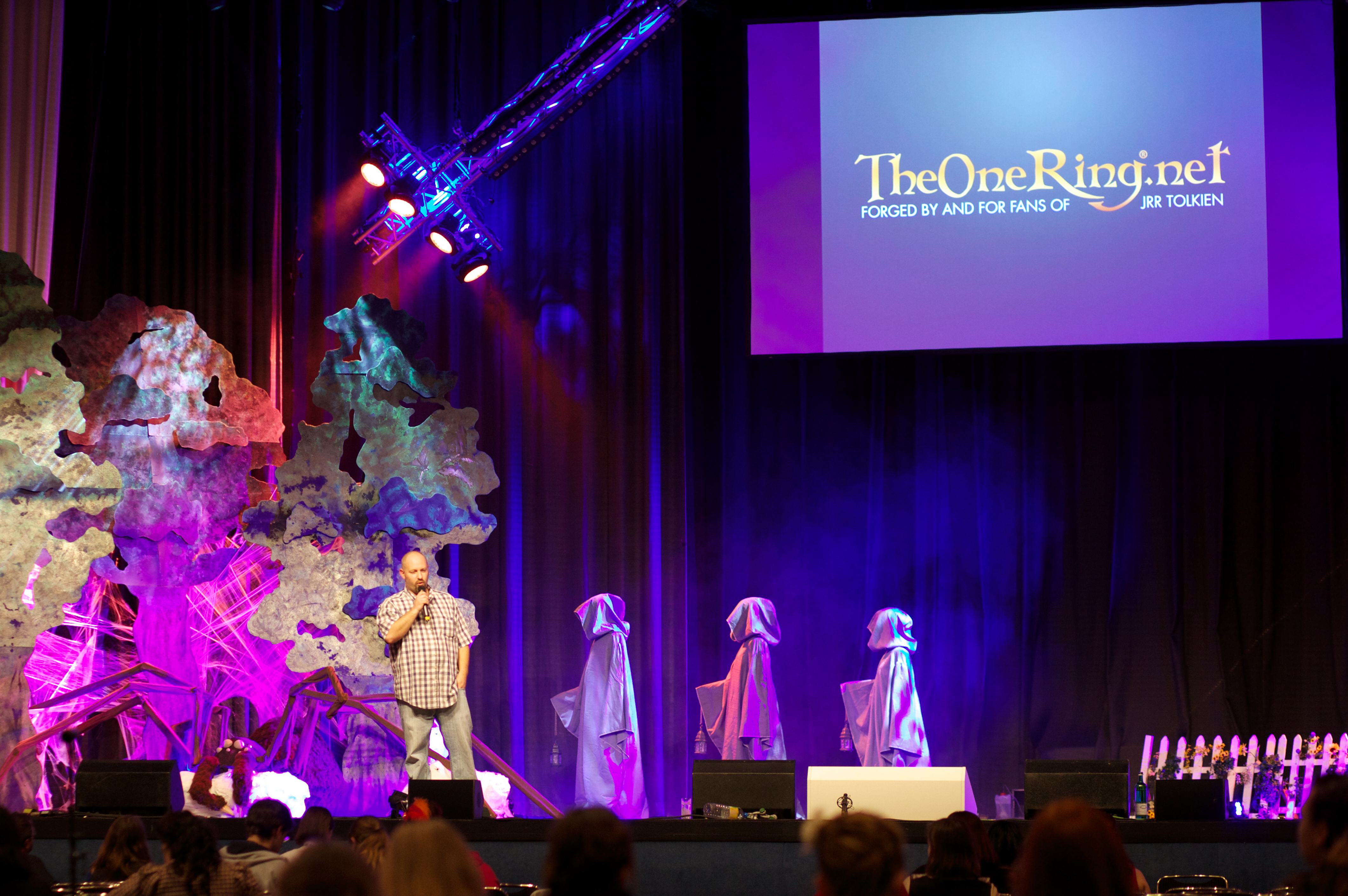 Near the end of the day, the entirety of the Tolkien programming track was introduced on stage at the Middle-earth kickoff party. Artists, musicians, writers and TheOneRing.net staff on hand, plus an Avalanche of Dwarves, as John Rhys-Davies put it, a Wizard and a pair of Hobbits converged on the Main Ballroom stage to thunderous applause. Moments later, the entire room went silent, you could almost hear a pin drop, along with one wee Hobbit singing his heart out.