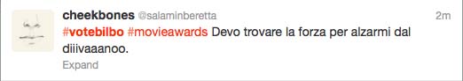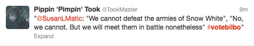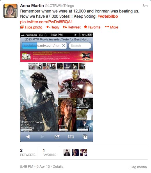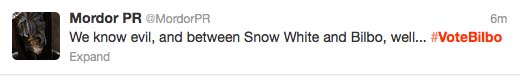 So there are a lot of funny #vote Bilbo tweets out there now, a few shared in this story. It became a thing. Staffer personal twitter accounts like @SlaveBoyFilms, @MrLDC, @Quickbeam2000, @maegwen, @CruisingCathy and probably lots of others I haven’t seen (add them in the story staffers!), have joined the cause. And fellow fans have been funny and brilliant. At one point, #votebilbo took the lead but Stewart has stormed back. Its hard to imagine a Tolkien fanbase, less rooted in Twitter, having the numbers and frankly the passion to carry this to a win when voting ends April 14. I don’t know if we care enough, but it still is fun! As this is being written, less than 100 votes separate the two figures with over 40 thousand tweets cast. But, hey, this is kind of fun! Being clever and supporting a fictional character is pretty good entertainment. And, we have renamed the other character Snow WhiteTreeOfGondor since she carries a LOTR shield in her MTV photo.