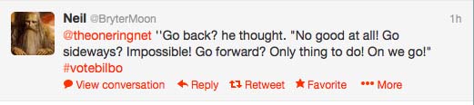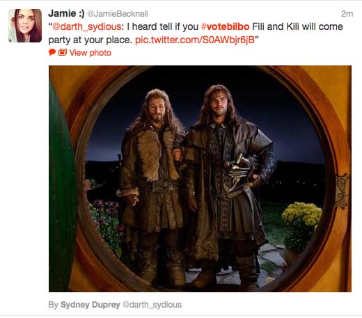 Joining in the Twitter voice, we redoubled our efforts and next thing you know, Iron Man was in the rear view mirror as well and Bilbo was in second place. A funny thing happened during the process: It became really fun on Twitter to #VoteBilbo! It is now something of a social media game to find clever ways to #VoteBilbo and we at TORn were able to re-tweet some of the better ideas, helping it all go viral. The group experience of the “old days” was back but in a much more interactive way. Fun with the community! Then, the hashtag started to trend in the UK and today in US as well. It has grown well beyond @TheOneRingNet and not long ago now the official Hobbit twitter account @TheHobbitMovie joined the cause. They promote the effort with dignity and restraint, something fans are not compelled to do.