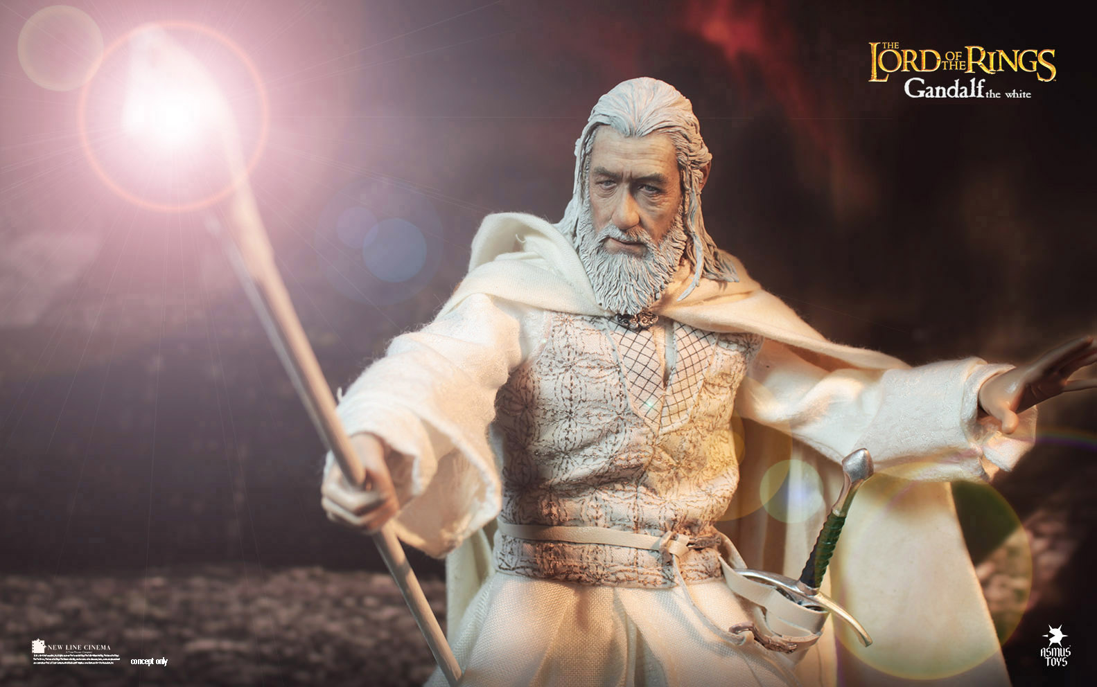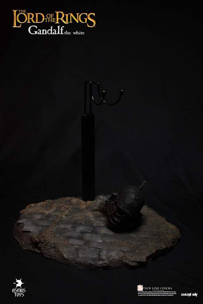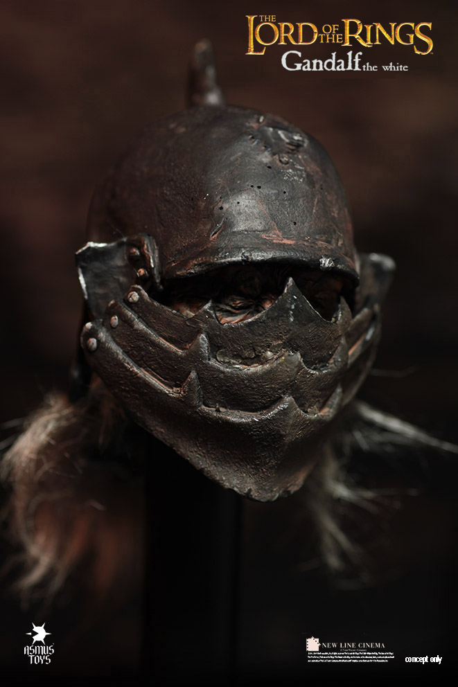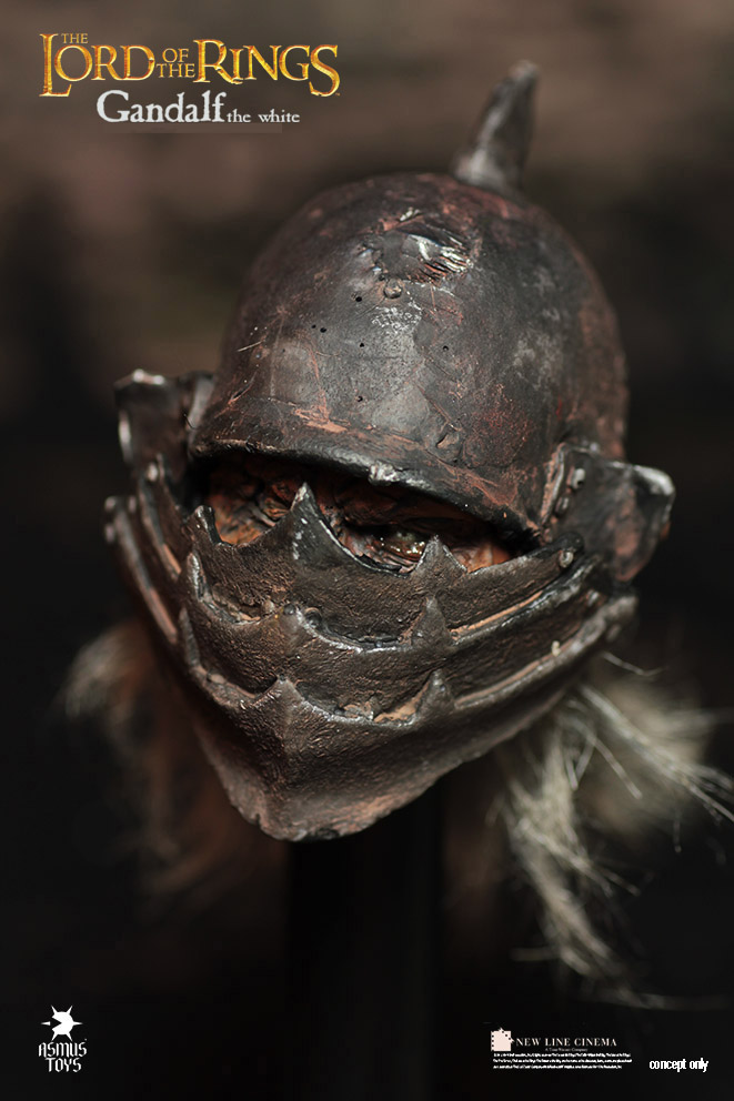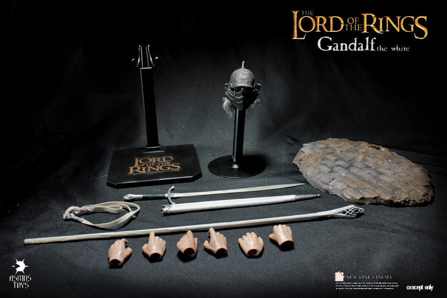 Asmus Toys is proud to present the next figure in their 1:6th action figure line for The Lord of the Rings Trilogy. Previously Asmus released two bad guys, the Morgul Lord and Gothmog. Now we get the first good guy in Gandalf the White. Gandalf comes with a really good likeness to Sir Ian McKellen, Glamdring, staff, hands galore, and a very cool severed Orc head that will fit on a regular 12″ body. No word yet on when Gandalf will go up for order or price but once he does, we will certainly let you all know.