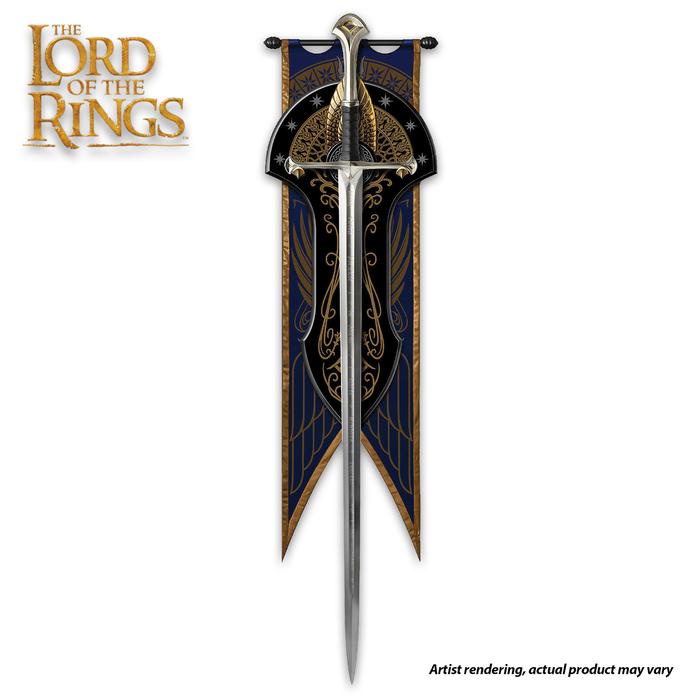 A 14 1/8” wooden wall display offers an intricately detailed gold-plated metal crest and gold-plated sword mounting arms, and also includes a Gondorian themed blue cloth banner to be hung behind the display. The display and banner feature the ancient heraldry of the Kingdom of Gondor: a flowering white tree of Gondor, the seven stars of Elendil, and a winged crown above them, the symbol of the king. The Museum Collection Anduril is considered the ultimate piece of the United Cutlery Museum Collection to most The Lord of the Ring collectors. Pre-order yours today to ensure you’re first in line for this long-awaited treasure. Anduril comes in with a price tag of $449, and fans can expect to have it around the end of November this year.
