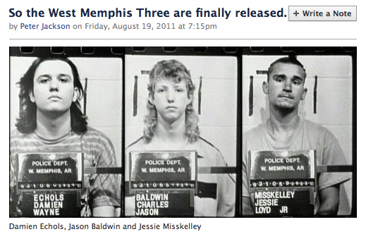 Peter Jackson, on his Facebook page, has written an essay about the West Memphis Three who were released from prison, one from death row two from life without parole, and released after 18 years, accused of the murder of three children. The news, as the essay makes clear, is very important to Jackson, the director behind Middle-earth films and friend to TheOneRing.net. You can read his Facebook post here.